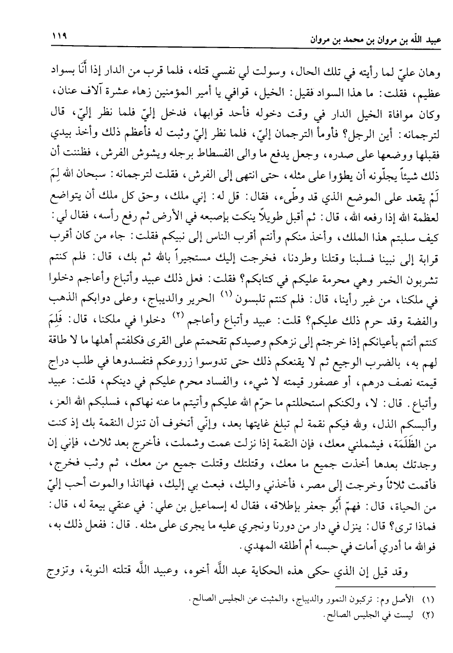 وهان علي لما رأيته في تلك الحال وسولت لي نفسي قتله فلما قرب من الدار إذا أنا بسواد عظيم فقلت ما هذا السواد فقيل الخيل قوافي يا أمير المؤمنين زهاء عشرة آلاف عنان وكان موافاة الخيل الدار في وقت دخوله فأحد قوابها فدخل إلي فلما نظر إلي قال لترجمانه أين الرجل فأومأ الترجمان إلي فلما نظر إلي وثبت له فأعظم ذلك وأخذ بيدي فقبلها ووضعها على صدره وجعل يدفع ما والى الفسطاط برجله ويشوش الفرش فظننت أن ذلك شيئا يجلونه أن يطؤوا على مثله حتى انتهى إلى الفرش فقلت لترجمانه سبحان الله لم لم يقعد على الموضع الذي قد وطئ فقال قل له إني ملك وحق كل ملك أن يتواضع لعظمة الله إذا رفعه الله قال ثم أقبل طويلا ينكت بإصبعه في الأرض ثم رفع رأسه فقال لي كيف سلبتم هذا الملك وأخذ منكم وأنتم أقرب الناس إلى نبيكم فقلت جاء من كان أقرب قرابة إلى نبينا فسلبنا وقتلنا وطردنا فخرجت إليك مستجيرا بالله ثم بك قال فلم كنتم تشربون الخمر وهي محرمة عليكم في كتابكم فقلت فعل ذلك عبيد وأتباع وأعاجم دخلوا في ملكنا من غير رأينا قال فلم كنتم تلبسون (1) الحرير والديباج وعلى دوابكم الذهب والفضة وقد حرم ذلك عليكم قلت عبيد وأتباع وأعاجم (2) دخلوا في ملكنا قال فلم كنتم أنتم بأعيانكم إذا خرجتم إلى نزهكم وصيدكم تقحمتم على القرى فكلفتم أهلها مالا طاقة لهم به بالضرب الوجيع ثم لا يقنعكم ذلك حتى تدوسوا زروعكم فتفسدوها في طلب دراج قيمته نصف درهم أو عصفور قيمته لا شئ والفساد محرم عليكم في دينكم قلت عبيد وأتباع قال لا ولكنكم استحللتم ما حرم الله عليكم وأتيتم ما عنه نهاكم فسلبكم الله العز وألبسكم الذل ولله فيكم نقمة لم تبلغ غايتها بعد وإني أتخوف أن تنزل النقمة بك إذ كنت من الظلمة فيشملني معك فإن النقمة إذا نزلت عمت وشملت فأخرج بعد ثلاث فإني إن وجدتك بعدها أخذت جميع ما معك وقتلتك وقتلت جميع من معك ثم وثب فخرج فأقمت ثلاثا وخرجت إلى مصر فأخذني واليك فبعث بي إليك فهاأنذا والموت أحب إلي من الحياة قال فهم أبو جعفر بإطلاقه فقال له إسماعيل بن علي في عنقي بيعة له قال فماذا ترى قال ينزل في دار من دورنا ونجري عليه ما يجرى على مثله قال ففعل ذلك به فوالله ما أدري أمات في حبسه أم أطلقه المهدي وقد قيل إن الذي حكى هذه الحكاية عبد الله أخوه وعبيد الله قتلته النوبة وتزوج