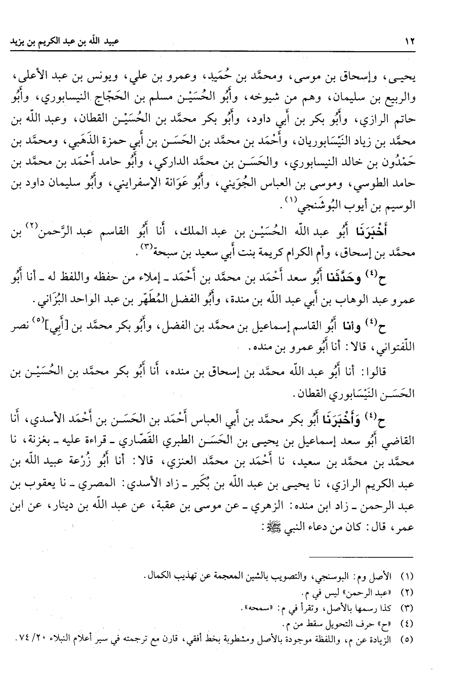 يحيى وإسحاق بن موسى ومحمد بن حميد وعمرو بن علي ويونس بن عبد الأعلى والربيع بن سليمان وهم من شيوخه وأبو الحسين مسلم بن الحجاج النيسابوري وأبو حاتم الرازي وأبو بكر بن أبي داود وأبو بكر محمد بن الحسين القطان وعبد الله بن محمد بن زياد النيسابوريان وأحمد بن محمد بن الحسن بن أبي حمزة الذهبي ومحمد بن حمدون بن خالد النيسابوري والحسن بن محمد الداركي وأبو حامد أحمد بن محمد بن حامد الطوسي وموسى بن العباس الجويني وأبو عوانة الإسفرايني وأبو سليمان داود بن الوسيم بن أيوب البوشنجي (1) أخبرنا أبو عبد الله الحسين بن عبد الملك أنا أبو القاسم عبد الرحمن (2) بن محمد بن إسحاق وأم الكرام بنت أبي سعيد بن سبحة (3) ح (4) وحدثنا أبو سعد أحمد بن محمد بن أحمد إملاء من حفظه واللفظ له أنا أبو عمرو عبد الوهاب بن أبي عبد الله بن مندة وأبو الفضل المطهر بن عبد الواحد البراني ح (4) وأنا أبو القاسم إسماعيل بن محمد بن الفضل وأبو بكر محمد بن أبي (5) نصر اللفتواني قالا أنا أبو عمرو بن منده قالوا أنا أبو عبد الله محمد بن إسحاق بن منده أنا أبو بكر محمد بن الحسين بن الحسن النيسابوري القطان ح (4) وأخبرنا أبو بكر محمد بن أبي العباس أحمد بن الحسن بن أحمد الأسدي أنا القاضي أبو سعد إسماعيل بن يحيى بن الحسن الطبري القصاري قراءة عليه بغزنة نا محمد بن محمد بن سعيد نا أحمد بن محمد العنزي قالا أنا أبو زرعة عبيد الله بن عبد الكريم الرازي نا يحيى بن عبد الله بن بكير زاد الأسدي المصري نا يعقوب بن عبد الرحمن زاد ابن منده الزهري عن موسى بن عقبة عن عبد الله بن دينار عن ابن عمر قال كان من دعاء النبي (صلى الله عليه وسلم) :