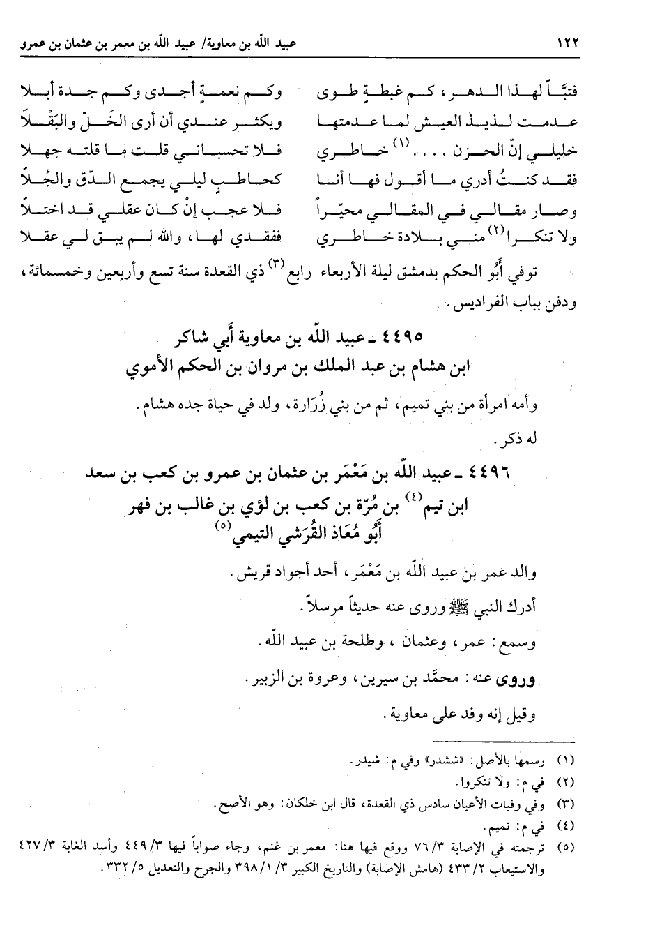 فتبا لهذا الدهر كم غبطة طوى * وكم نعمة أجدى وكم جدة أبلا عدمت لذيذ العيش لما عدمتها * ويكثر عندي أن أرى الخل والبقلا خليلي إن الحزن (1) خاطري * فلا تحسباني قلت ما قلت جهلا فقد كنت أدري ما أقول فها أنا * كحاطب ايلى يجمع الدق والجلا وصار مقالي في المقالي محيرا فلا عجب إن كان عقلي قد اختلا ولا تنكرا (2) مني بلادة خاطري * ففقدي لها والله لم يبق لي عقلا * توفى أبو الحكم بدمشق ليلة الأربعاء رابع (3) ذي القعدة سنة تسع وأربعين وخمسمائة ودفن بباب الفراديس 4495 - عبيد الله بن معاوية أبي شاكر بن هشام بن عبد الملك بن مروان بن الحكم الأموي وأمه امرأة من بني تميم ثم من بني زرارة ولد في حياة جده هشام له ذكر