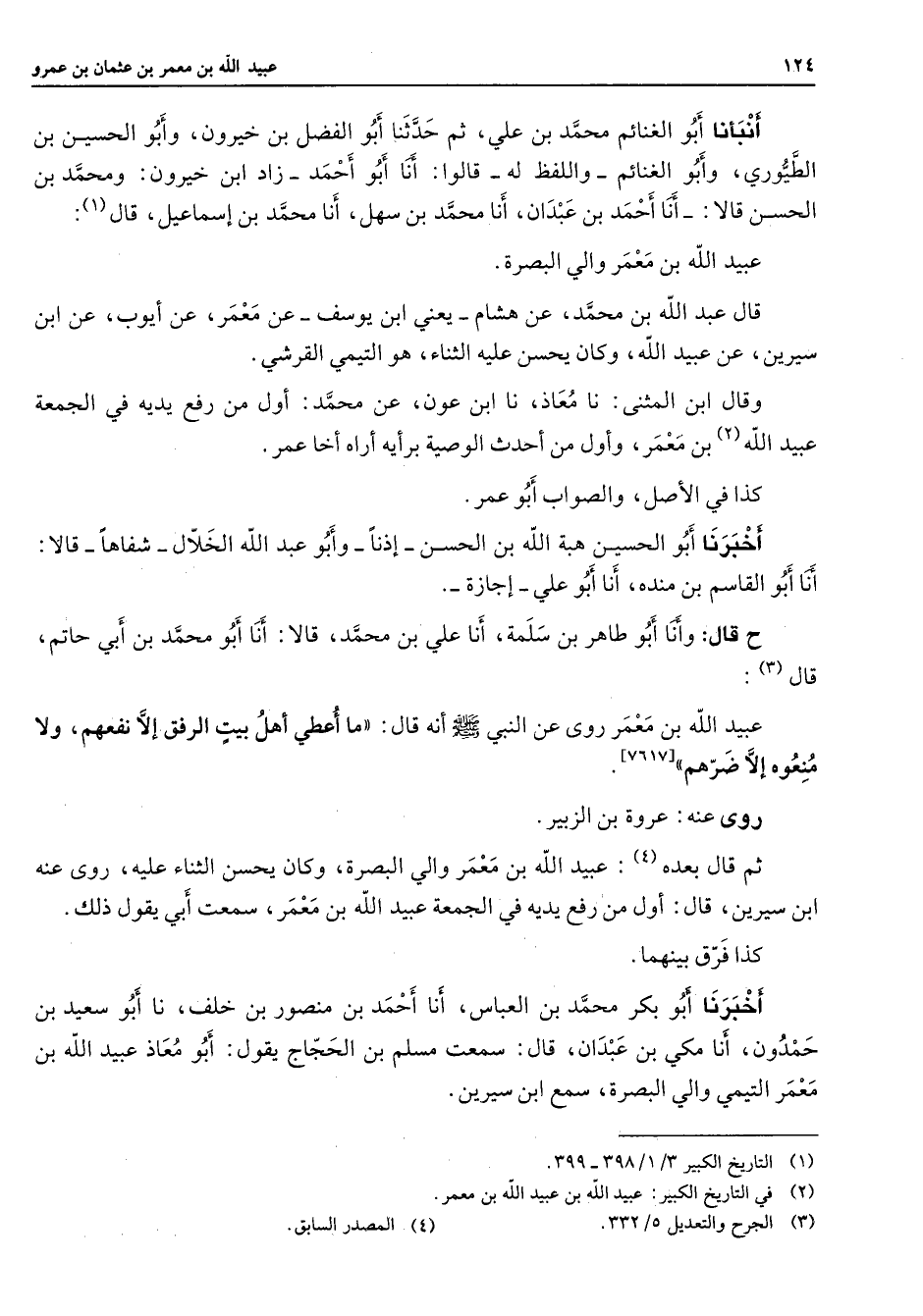 أنبأنا أبو الغنائم محمد بن علي ثم حدثنا أبو الفضل بن خيرون وأبو الحسين بن الطيوري وأبو الغنائم واللفظ له قالوا أنا أبو أحمد زاد ابن خيرون ومحمد بن الحسن قالا أنا أحمد بن عبدان أنا محمد بن سهل أنا محمد بن إسماعيل قال (1) عبيد الله بن معمر والي البصرة قال عبيد الله بن محمد عن هشام يعني ابن يوسف عن معمر عن أيوب عن ابن سيرين عن عبيد الله وكان يحسن عليه الثناء هو التيمي القرشي وقال ابن المثنى نا معاذ نا ابن عون عن محمد أول من رفع يديه في الجمعة عبيد الله (2) بن معمر وأول من أحدث الوصية برأيه أراه أخا عمر كذا في الأصل والصواب أبو عمر أخبرنا أبو الحسين هبة الله بن الحسن إذنا وأبو عبد الله الخلال شفاها قالا أنا أبو القاسم بن منده أنا أبو علي إجازة ح قال وأنا أبو طاهر بن سلمة أنا علي بن محمد قالا أنا أبو محمد بن أبي حاتم قال (3) عبيد الله بن معمر روى عن النبي (صلى الله عليه وسلم) أنه قال ما أعطي أهل بيت الرفق إلا نفعهم ولا منعوه إلا ضرهم