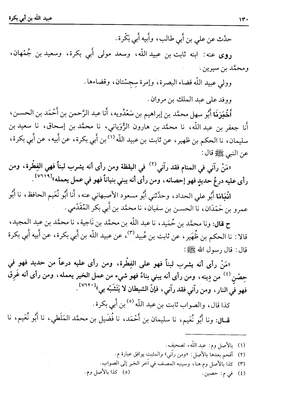 [7619] أنبأنا أبو علي الحداد وحدثني أبو مسعود الأصبهاني عنه أنا أبو نعيم الحافظ نا أبو عمرو بن حمدان نا الحسن بن سفيان نا محمد بن أبي بكر المقدمي ح قال ونا محمد بن حميد نا عبد الله بن محمد بن ناجية نا محمد بن عبد المجيد قالا نا الحكم بن ظهير عن ثابت بن عبيد (3) عن عبيد الله بن أبي بكرة عن أبيه أبي بكرة قال قال رسول الله (صلى الله عليه وسلم) من رأى أنه يشرب لبنا فهو على الفطرة ومن رأى عليه درعا من حديد فهو في حصن (4) من دينه ومن رأى أنه يبني بناء فهو شئ من عمل الخير يعمله ومن رأى أنه غرق فهو في النار ومن رآني فقد رآني فإن الشيطان لا يتشبه بي