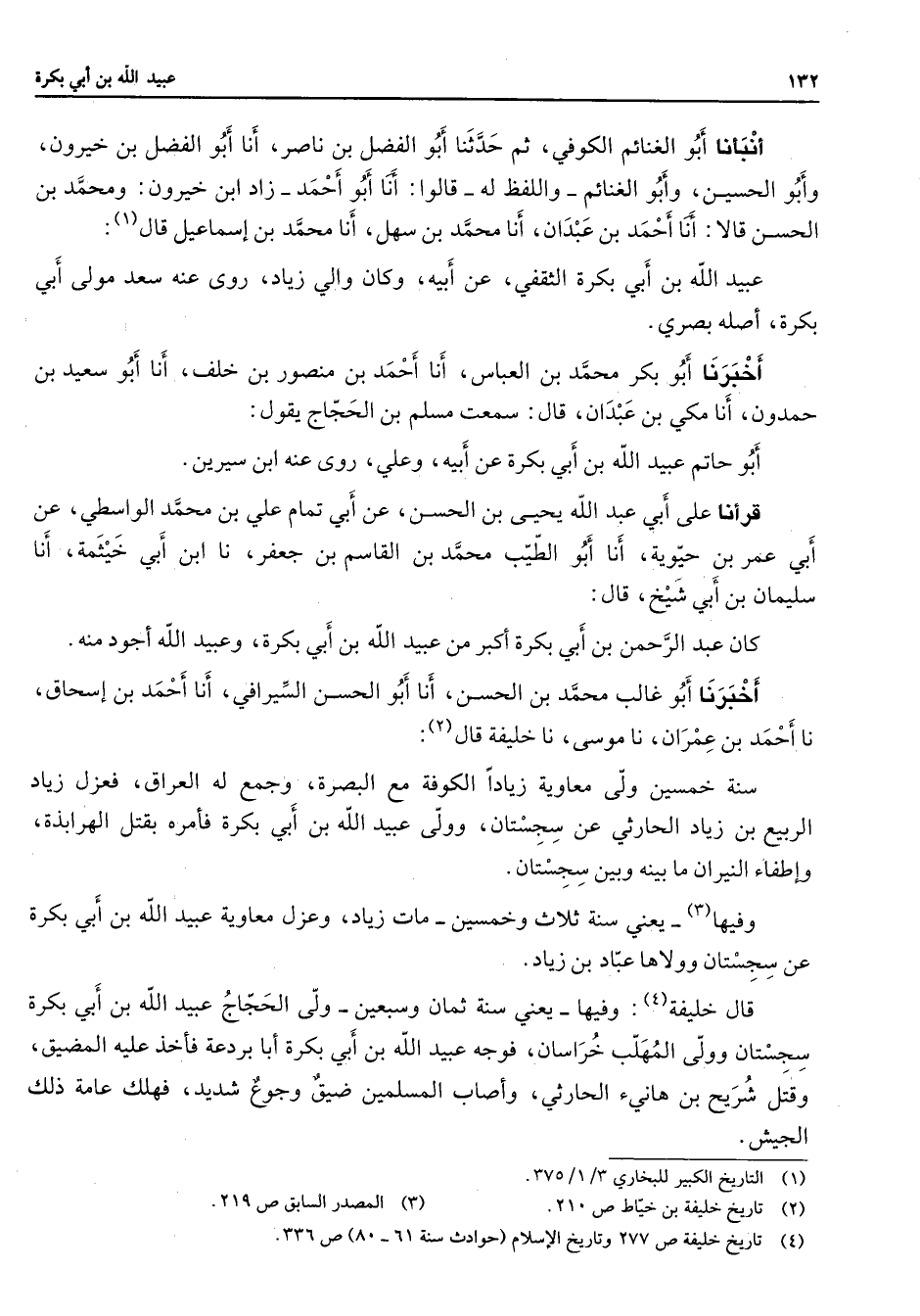 أنبأنا أبو الغنائم الكوفي ثم حدثنا أبو الفضل بن ناصر أنا أبو الفضل بن خيرون وأبو الحسين وأبو الغنائم واللفظ له قالوا أنا أبو أحمد زاد بن خيرون ومحمد بن الحسن قالا أنا أحمد بن عبدان أنا محمد بن سهل أنا محمد بن إسماعيل قال (1) عبيد الله بن أبي بكرة الثقفي عن أبيه وكان والي زياد روى عنه سعد مولى أبي بكرة أصله بصري أخبرنا أبو بكر محمد بن العباس أنا أحمد بن منصور بن خلف أنا أبو سعيد بن حمدون أنا مكي بن عبدان قال سمعت مسلم بن الحجاج يقول أبو حاتم عبيد الله بن أبي بكرة عن أبيه وعلي روى عنه ابن سيرين قرأنا على أبي عبيد الله يحيى بن الحسن عن أبي تمام علي بن محمد الواسطي عن أبي عمر بن حيوية أنا أبو الطيب محمد بن القاسم بن جعفر نا ابن أبي خيثمة أنا سليمان بن أبي شيخ قال كان عبد الرحمن بن أبي بكرة أكبر من عبيد الله بن أبي بكرة وعبيد الله أجود منه أخبرنا أبو غالب محمد بن الحسن أنا أبو الحسن السيرافي أنا أحمد بن إسحاق نا أحمد بن عمران نا موسى نا خليفة قال (2) سنة خمسين ولى معاوية زيادا الكوفة مع البصرة وجمع له العراق فعزل زياد الربيع بن زياد الحارثي عن سجستان وولى عبيد الله بن أبي بكرة فأمره بقتل الهرابذة وإطفاء النيران بينه وبين سجستان وفيها (3) يعني سنة ثلاث وخمسين مات زياد وعزل معاوية عبيد الله بن أبي بكرة عن سجستان وولاها عباد بن زياد قال خليفة (4) وفيها ويعني سنة ثمان وسبعين ولى الحجاج عبيد الله بن أبي بكرة سجستان وولى المهلب خراسان فوجه عبيد الله بن أبي بكرة أنا بردعة فأخذ عليه المضيق وقتل شريح بن هانئ الحارثي وأصاب المسلمين ضيق وجوع شديد فهلك عامة ذلك الجيش