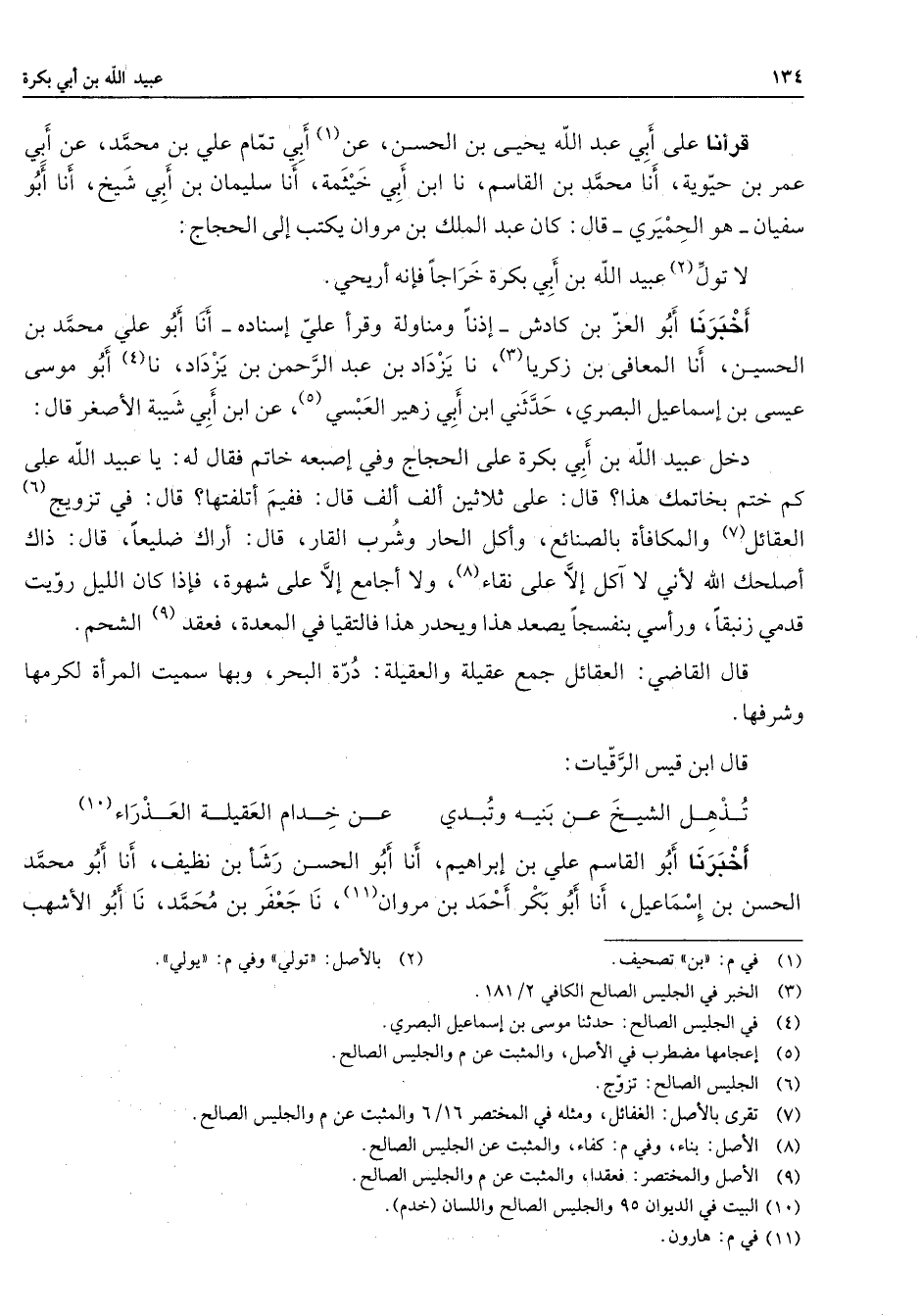 قرأنا على أبي عبد الله يحيى بن الحسن عن (1) أبي تمام علي بن محمد عن أبي عمر بن حيوية أنا محمد بن القاسم نا ابن أبي خيثمة أنا سليمان بن أبي شيخ أنا أبو سفيان هو الحميري قال كان عبد الملك بن مروان يكتب إلى الحجاج لا تول (2) عبيد الله بن أبي بكرة خراجا فإنه أريحي أخبرنا أبو العز بن كادش إذنا ومناولة وقرأ علي إسناده أنا أبو علي محمد بن الحسين أنا المعافي بن زكريا (3) نا يزداد بن عبد الرحمن بن يزداد نا (4) أبو موسى عيسى بن إسماعيل البصري حدثني ابن أبي زهير العبسي (5) عن ابن أبي شيبة الأصغر قال دخل عبيد الله بن أبي بكرة على الحجاج وفي إصبعه خاتم فقال له يا عبيد الله على كم ختم بخاتمك هذا قال على ثلاثين ألف ألف قال ففيم أتلفتها قال في تزويج (6) العقائل (7) والمكافأة بالصنائع وأكل الحار وشرب القار قال أراك ضليعا قال ذاك أصلحك الله لأني لا آكل إلا على نقاء (8) ولا أجامع إلا على شهوة فإذا كان الليل رويت قدمي زنبقا ورأسي بنفسجا يصعد هذا ويحدر هذا فالتقيا في المعدة فعقد (9) الشحم قال القاضي العقائل جمع عقيلة والعقيلة درة البحر وبها سميت المرأة لكرمها وشرفها قال ابن قيس الرقيات * تذهل الشيخ عن بنيه وتبدي * عن خدام العقيلة العذراء (10) * أخبرنا أبو القاسم علي بن إبراهيم أنا أبو الحسن رشأ بن نظيف أنا أبو محمد الحسن بن إسماعيل أنا أبو بكر أحمد بن مروان (11) نا جعفر بن محمد نا أبو الأشهب