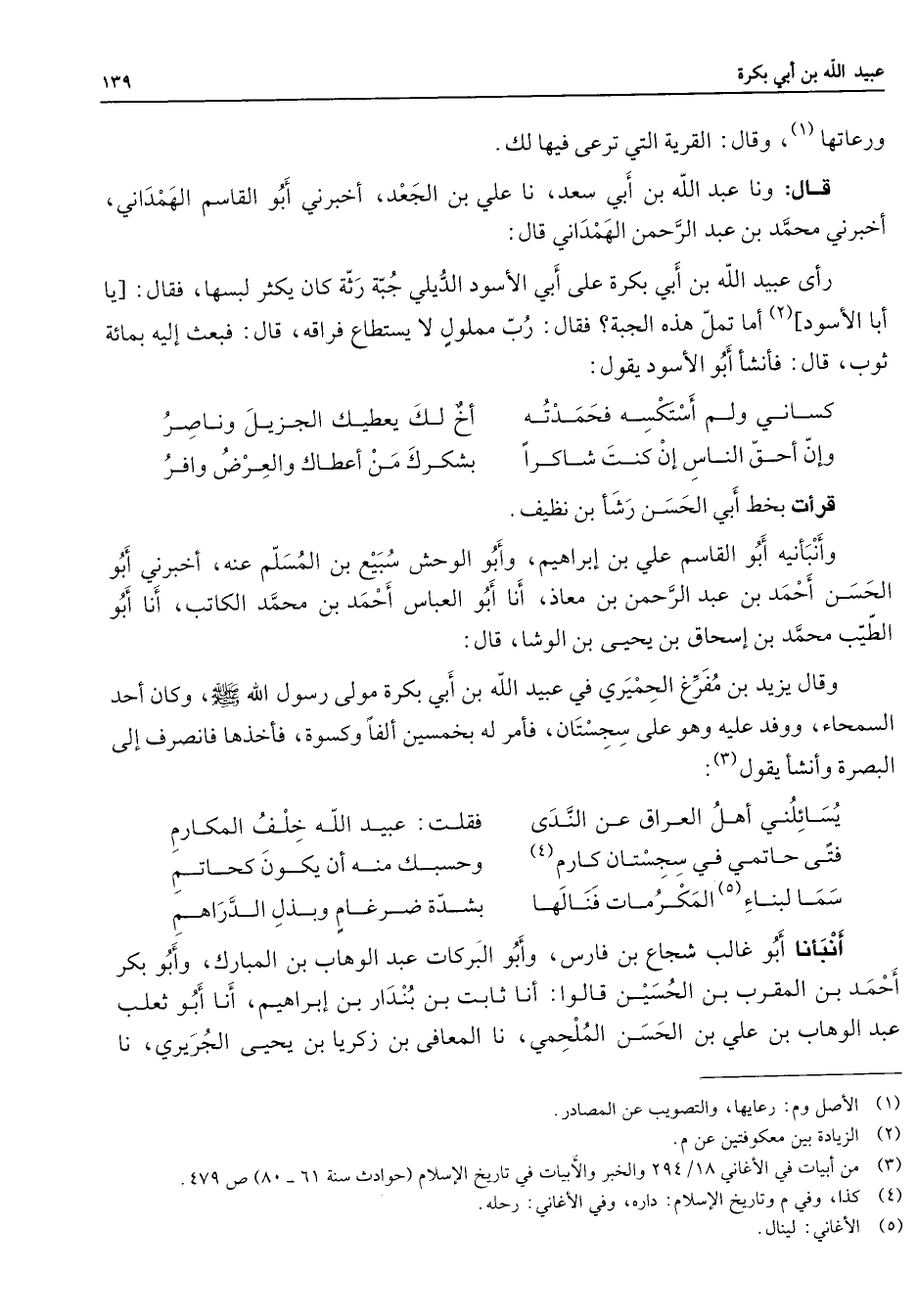 ورعاتها (1) وقال القرية التي ترعى فيها لك قال ونا عبد الله بن أبي سعد نا علي بن الجعد أخبرني أبو القاسم الهمداني أخبرني محمد بن عبد الرحمن الهمداني قال رأى عبيد الله بن أبي بكرة على أبي الأسود الديلي جبة رثة كان يكثر لبسها فقال يا أبا الأسود (2) أما تمل هذه الجبة فقال رب مملول لا يستطاع فراقه قال فبعث إليه بمائة ثوب قال فأنشأ أبو الأسود يقول * كساني ولو استكسه فحمدته * أخ لك يعطيك الجزيل وناصر وإن أحق الناس إن كنت شاكرا * بشكرك من أعطاك والعرض وافر * قرأت بخط أبي الحسن رشأ بن نظيف وأنبأنيه أبو القاسم علي بن إبراهيم وأبو الوحش سبيع بن المسلم عنه أخبرني أبو الحسن أحمد بن عبد الرحمن بن معاذ أنا أبو العباس أحمد بن محمد الكاتب أنا أبو الطيب محمد بن إسحاق بن يحيى بن الوشا قال وقال يزيد بن مفرغ الحميري في عبيد الله بن أبي بكرة مولى رسول الله (صلى الله عليه وسلم) وكان أحد السمحاء ووفد عليه وهو في سجستان فأمر له بخمسين ألفا وكسوة فأخذها فانصرف إلى البصرة وأنشأ يقول (3) * يسائلني أهل العراق عن الندى * فقلت عبيد الله خلف المكارم فتى حاتمي في سجستان كارم (4) * وحسبك منه أن يكون كحاتم سما لبناء (5) المكرمات فنالها * بشدة ضرغام وبذل الدراهم * أنبأنا أبو غالب شجاع بن فارس وأبو البركات عبد الوهاب بن المبارك وأبو بكر أحمد بن المقرب بن الحسين قالوا أنا ثابت بن بندار بن إبراهيم أنا أبو ثعلب عبد الوهاب بن علي بن الحسن الملحمي نا المعافى بن زكريا بن يحيى الجريري نا