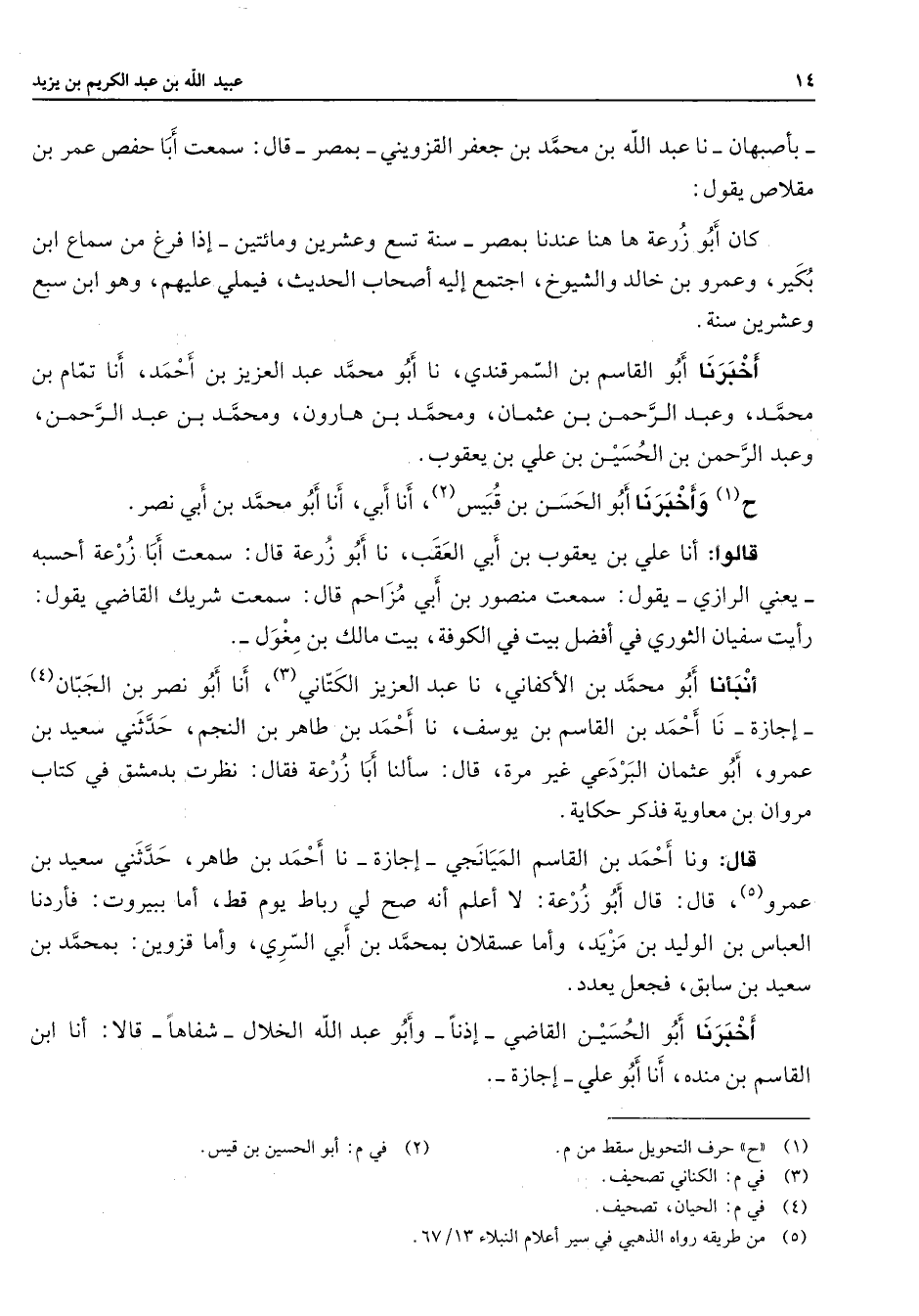 بأصبهان نا عبد الله بن محمد بن جعفر القزويني بمصر قال سمعت أبا حفص عمر بن مقلاص يقول كان أبو زرعة ها هنا عندنا بمصر سنة تسع وعشرين ومائتين إذا فرغ من سماع ابن بكير وعمرو بن خالد والشيوخ اجتمع إليه أصحاب الحديث فيملي عليهم وهو ابن سبع وعشرين سنة أخبرنا أبو القاسم بن السمرقندي نا أبو محمد عبد العزيز بن أحمد أنا تمام بن محمد وعبد الرحمن بن عثمان ومحمد بن هارون ومحمد بن عبد الرحمن وعبد الرحمن بن الحسين بن علي بن يعقوب ح (1) وأخبرنا أبو الحسن بن قبيس (2) أنا أبي أنا أبو محمد بن أبي نصر قالوا أنا علي بن يعقوب بن أبي العقب نا أبو زرعة قال سمعت أبا زرعة أحسبه يعني الرازي يقول سمعت منصور بن أبي مزاحم قال سمعت شريك القاضي يقول رأيت سفيان الثوري في أفضل بيت في الكوفة بيت مالك بن مغول أنبأنا أبو محمد بن الأكفاني نا عبد العزيز الكتاني (3) أنا أبو نصر بن الجبان (4) إجازة نا أحمد بن القاسم بن يوسف نا أحمد بن طاهر بن النجم حدثني سعيد بن عمرو أبو عثمان البردعي غير مرة قال سألنا أبا زرعة فقال نظرت بدمشق في كتاب مروان بن معاوية فذكر حكاية قال وأنا أحمد بن القاسم الميانجي إجازة نا أحمد بن طاهر حدثني سعيد بن عمرو (5) قال قال أبو زرعة لا أعلم أنه صح لي رباط يوم قط أما ببيروت فأردنا العباس بن الوليد بن مزيد وأما عسقلان بمحمد بن أبي السري وأما قزوين بمحمد بن سعيد بن سابق فجعل يعدد أخبرنا أبو الحسين القاضي إذنا وأبو عبد الله الخلال شفاها قالا أنا ابن القاسم بن منده أنا أبو علي إجازة -
