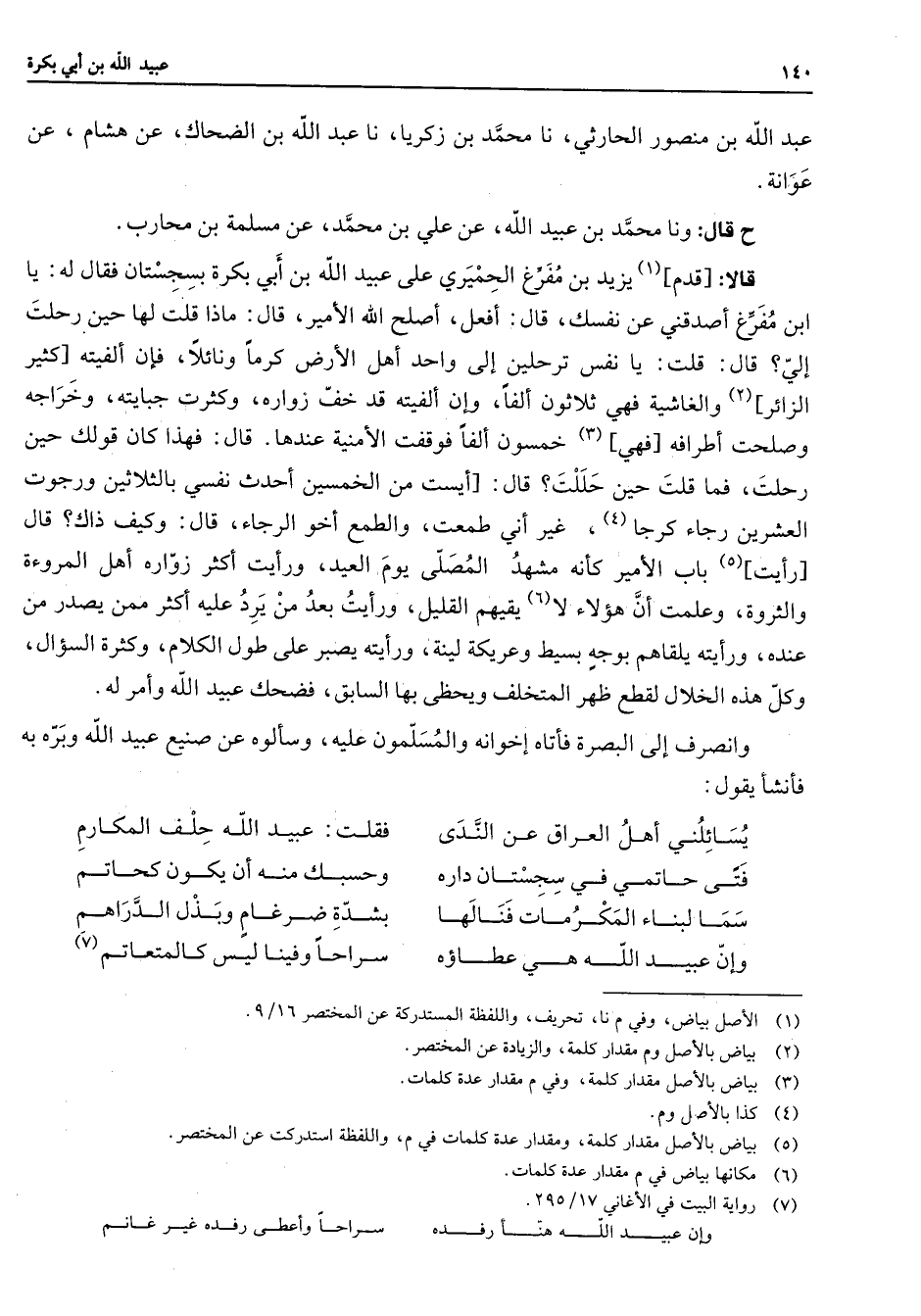 عبد الله بن منصور الحارثي نا محمد بن زكريا نا عبد الله بن الضحاك عن هشا عن عوانة ح قال ونا محمد بن عبيد الله عن علي بن محمد عن مسلمة بن محارب قالا قدم (1) يزيد بن مفرغ الحميري على عبيد الله بن أبي بكرة بسجستان فقال له يا ابن مفرغ أصدقني عن نفسك قال أفعل أصلح الله الأمير قال ماذا قلت لها حين رحلت إلي قال قلت يا نفس ترحلين إلى واحد أهل الأرض كرما ونائلا فإن ألفيته كثير الزائر (2) والغاشية فهي ثلاثون ألفا وإن ألفيته قد خف زواره وكثرت جبايته وخراجه وصلحت أطرافه فهي (3) خمسون ألفا فوقفت الأمنية عندها قال فهذا كان قولك حين رحلت فما قلت حين حللت قال أيست من الخمسين أحدث نفسي بالثلاثين ورجوت العشرين رجاء كرجا (4) غير إني طمعت والطمع أخو الرجا قال وكيف ذاك قال رأيت (5) باب الأمير كأنه مشهد المصلى يوم العيد ورأيت أكثر زواره أهل المروءة والثروة وعلمت أن هؤلاء لا (6) يقيهم القليل ورأيت بعد من يرد عليه أكثر ممن يصدر من عنده ورأيته يلقاهم بوجه بسيط وعريكة لينة ورأيته يصبر على طول الكلام وكثرة السؤال وكل هذه الخلال لقطع ظهر المتخلف ويحظى بها السابق فضحك عبيد الله وأمر له وانصرف إلى البصرة فأتاه إخوانه والمسلمون عليه وسألوه عن صنيع عبيد الله وبره به فأنشأ يقول * يسائلني أهل العراق عن الندى * فقلت عبيد الله حلف المكارم فتى حاتمي في سجستان دارم * وحسبك منه أن يكون كحاتم سما لبناء المكرمات فنالها * بشدة ضرغام وبذل الدراهم وإن عبيد الله هي عطاؤه * سراحا وفينا ليس كالمتعاتم (7)
