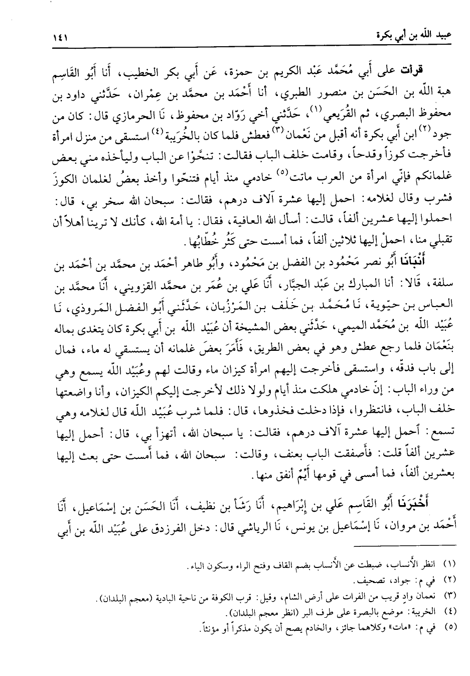 قرأت على أبي محمد عبد الكريم بن حمزة عن أبي بكر الخطيب أنا أبو القاسم هبة الله بن الحسن بن منصور الطبري أنا أحمد بن محمد بن عمران حدثني داود بن محفوظ البصري ثم القريعي (1) حدثني أخي رواد بن محفوظ نا الحرمازي قال كان من جود (2) ابن أبي بكرة أنه أقبل من نعمان (3) فعطش فلما كان بالخريبة (4) استسقى من منزل امرأة فأخرجت كوزا وقدحا وقامت خلف الباب فقالت تنحوا عن الباب وليأخذه مني بعض غلمانكم فإني امرأة من العرب ماتت (5) خادمي منذ أيام فتنحوا وأخذ بعض لغلمان الكوز فشرب وقال لغلامه احمل إليها عشرة آلاف درهم فقالت سبحان الله سخر بي قال احملوا إليها عشرين ألفا قالت اسأل الله العافية فقال يا أمة الله كأنك لا ترينا أهلا أن تقبلي منا احمل إليها ثلاثين ألفا فما أمست حتى كثر خطابها أنبأنا أبو نصر محمود بن الفضل بن محمود وأبو طاهر أحمد بن محمد بن أحمد بن سلفة قالا أنا المبارك بن عبد الجبار أنا علي بن عمر بن محمد القزويني أنا محمد بن العباس بن حيوية نا محمد بن خلف بن المرزبان حدثني أبو الفضل المروذي نا عبيد الله بن محمد الميمي حدثني بعض المشيخة أن عبيد الله بن أبي بكرة كان يتغدى بماله بنعمان فلما رجع عطش وهو في بعض الطريق فأمر بعض غلمانه أن يستسقي له ماء فمال إلى باب فدقه واستسقى فأخرجت إليهم امرأة كيزان ماء وقالت لهم وعبيد الله يسمع وهي من وراء الباب إن خادمي هلكت منذ أيام ولولا ذلك لأخرجت إليكم الكيزان وأنا واضعتها خلف الباب فانتظروا فإذا دخلت فخذوها قال فلما شرب عبيد الله قال لغلامه وهي تسمع احمل إليها عشرة آلاف درهم فقالت يا سبحان الله أتهزأ بي قال احمل إليها عشرين ألفا قلت فأصفقت الباب بعنف وقالت سبحان الله فما أمست حتى بعث إليها بعشرين ألفا فما أمسى في قومها أيم انفق منها أخبرنا أبو القاسم علي بن إبراهيم أنا رشأ بن نظيف أنا الحسن بن إسماعيل أنا أحمد بن مروان أنا إسماعيل بن يونس نا الرياشي قال دخل الفرزدق على عبيد الله بن أبي