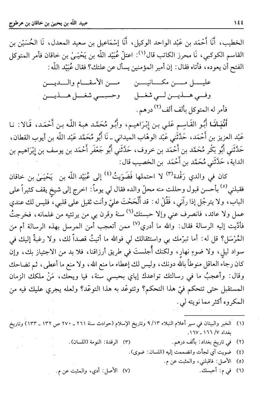 الخطيب أنا أحمد بن عبد الواحد الوكيل أنا إسماعيل بن سعيد المعدل نا الحسين بن القاسم الكوكبي نا محرز الكاتب قال (1) اعتل عبيد الله بن يحيى بن خاقان فأمر المتوكل الفتح أن يعوده فأتاه فقال إن أمير المؤمنين يسأل عن علتك فقال عبيد الله * عليل من مكانين * من الأسقام والدين وفي هذين لي شغل * وحسبي شغل هذين * فأمر المتوكل بألف ألف (2) درهم أنبأنا أبو القاسم علي بن إبراهيم وأبو محمد هبة الله بن أحمد قالا نا عبد العزيز بن أحمد حدثني عبد الوهاب الميداني نا أبو محمد عبد الله بن أيوب القطان حدثني أبو بكر محمد بن أحمد بن خروف حدثني أبو جعفر أحمد بن يوسف بن إبراهيم بن الداية حدثني محمد بن أحمد بن الخصيب قال كان في والدي رقدة (3) لا احتملها فضويت (4) إلى عبيد الله بن يحيى بن خاقان فقبلي (5) بأحسن قبول وحللت منه محل والده فقال لي يوما اخرج إلى شيخ يقف كثيرا على الباب ولا يترجل إذا رآني فقل له قد ألححت علي وأنت ثقيل على قلبي فليس لك عندي عمل ولا عائد فانصرف عني وإلا حبستك (6) سنة وقرن بي من يرتئيه من غلمانه فخرجت فأديت إليه الرسالة فقال والله ما أدري (7) ممن أتعجب أمن المرسل بهذه الرسالة أم من المرسل قل له أما تبرمك بي واستثقالك لي فوالله ما أتيت قصدا لك ولا رغبة إليك في سواد ليل ولا ضوء نهار ولكنك أجلست في طريق أرزاقنا فلا بد من الاجتياز بك وإن كان رجاء العاقل منوطا بالله دونك وليس لك إعطاء ما منع الله ولا منع ما أعطى ثم تضاحك وقال وأعجب ما في رسالتك تواعدك إياي بحبسي سنة فيا ويحك من ملكك الزمان المستقبل حتى تتحكم في هذا التحكم وتتوعد به هذا التوعد ولعله يجري عليك فيه من المكروه أكثر مما نويته لي
