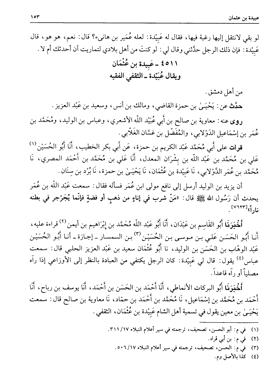 لو بقي لانتقل إليها رغبة فيها فقال له عبيدة لعله عمير بن هانئ قال نعم هو هو قال عبيدة فإن ذلك الرجل حدثني وقال لي لو كنت من أهل بلادي لتماريت أن أحدثك أم لا 4511 - عبيدة بن عثمان ويقال عبيدة الثقفي الفقيه من أهل دمشق حدث عن يحيى بن حمزة القاضي ومالك بن أنس وسعيد بن عبد العزيز روى عنه معاوية بن صالح بن أبي عبيد الله الأشعري وعباس بن الوليد ومحمد بن عمر بن إسماعيل الدولابي والمفضل بن غسان الغلابي قرأت على أبي محمد عبد الكريم بن حمزة عن أبي بكر الخطيب أنا أبو الحسين (1) علي بن محمد بن عبد الله بن بشران المعدل أنا علي بن محمد بن أحمد المصري نا محمد بن عمر الدولابي نا عبيدة بن عثمان نا يحيى بن حمزة نا برد بن سنان أن يزيد بن الوليد أرسل إلى نافع مولى ابن عمر فسأله فقال سمعت عبد الله بن عمر يحدث أن رسول الله (صلى الله عليه وسلم) قال من شرب في إناء من ذهب أو فضة فإنما يجرجر في بطنه نارا