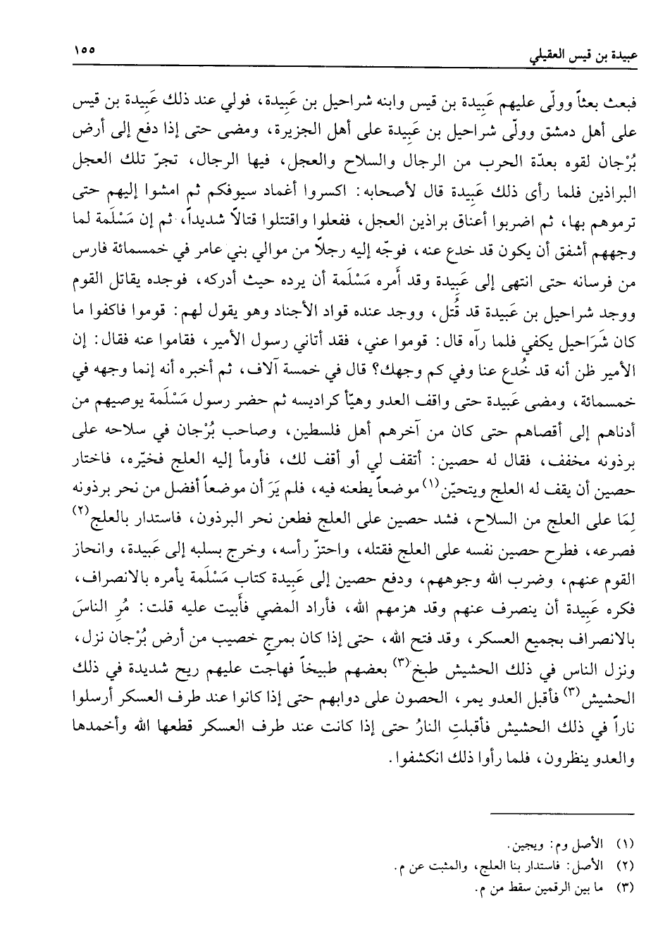 فبعث بعثا وولى عليهم عبيدة بن قيس وابنه شراحيل بن عبيدة فولي عند ذلك عبيدة بن قيس على أهل دمشق وولى شراحيل بن عبيدة على أهل الجزيرة ومضى حتى إذا دفع إلى أرض برجان لقوه بعدة الحرب من الرجال والسلاح والعجل فيها الرجال تجر تلك العجل البراذين فلما رأى ذلك عبيدة قال لأصحابه اكسروا أغماد سيوفكم ثم امشوا إليهم حتى ترموهم بها ثم اضربوا أعناق براذين العجل ففعلوا واقتتلوا قتالا شديدا ثم إن مسلمة لما وجههم أشفق أن يكون قد خدع عنه فوجه إليه رجلا من موالي بني عامر في خمسمائة فارس من فرسانه حتى انتهى إلى عبيدة وقد أمره مسلمة أن يرده حيث أدركه فوجده يقاتل القوم ووجد شراحيل بن عبيدة قد قتل ووجد عنده قواد الأجناد وهو يقول لهم قوموا فاكفوا ما كان شراحيل يكفيه فلما رآه قال قوموا عني فقد أتاني رسول الأمير فقاموا عنه فقال إن الأمير ظن أنه قد خدع عنا وفي كم وجهك قال في خمسة آلاف ثم أخبره أنه إنما وجهه في خمسمائة ومضى عبيدة حتى واقف العدو وهيأ كراديسه ثم حضر رسول مسلمة يوصيهم من أدناهم إلى أقصاهم حتى كان من آخرهم أهل فلسطين وصاحب برجان في سلاحه على برذونه مخفف فقال له حصين أتقف لي أو أقف لك فأومأ إليه العلج فخيره فاختار حصين أن يقف له العلج ويتحين (1) موضعا يطعنه فيه فلم يرى أن موضعا أفضل من نحر برذونه لما على العلج من السلاح فشد حصين على العلج فطعن نحر البرذون فاستدار بالعلج (2) فصرعه فطرح حصين نفسه على العلج فقتله واحتز رأسه وخرج بسلبه إلى عبيدة وانحاز القوم عنهم وضرب الله وجوههم ودفع حصين إلى عبيدة كتاب مسلمة يأمره بالانصراف فكره عبيدة أن ينصرف عنهم وقد هزمهم الله فأراد المضي فأبيت عليه قلت مر الناس بالانصراف بجميع العسكر وقد فتح الله حتى إذا كان بمرج خصيب من أرض برجان نزل ونزل الناس في ذلك الحشيش طبخ (3) بعضهم طبيخا فهاجت عليهم ريح شديدة في ذلك الحشيش (3) فأقبل العدو يمر الحصون على دوابهم حتى إذا كانوا عند طرف العسكر أرسلوا نارا في ذلك الحشيش فأقبلت النار حتى إذا كانت عند طرف العسكر قطعها الله وأخمدها والعدو ينظرون فلما رأوا ذلك انكشفوا
