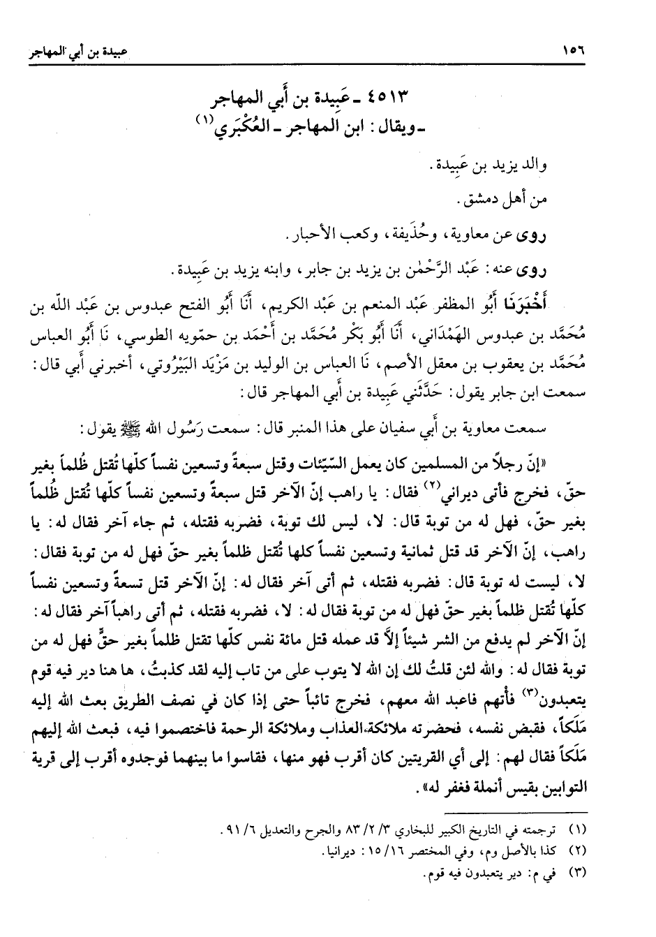 4513 - عبيدة بن أبي المهاجر ويقال ابن المهاجر العكبري (1) والد يزيد بن عبيدة من أهل دمشق روى عن معاوية وحذيفة وكعب الأحبار روى عنه عبد الرحمن بن يزيد بن جابر وابنه يزيد بن عبيدة أخبرنا أبو المظفر عبد المنعم بن عبد الكريم أنا أبو القتح عبدوس بن عبد الله بن محمد بن عبدوس الهمداني أنا أبو بكر محمد بن أحمد بن حموية الطوسي نا أبو العباس محمد بن يعقوب بن معقل الأصم نا العباس بن الوليد بن مزيد البيروتي أخبرني أبي قال سمعت ابن جابر يقول حدثني عبيدة بن أبي المهاجر قال سمعت معاوية بن أبي سفيان على هذا المنبر قال سمعت رسول الله (صلى الله عليه وسلم) يقول إن رجلا من المسلمين كان يعمل السيئات وقتل سبعة وتسعين نفسا كلها تقتل ظلما بغير حق فخرج فأتى ديراني (2) فقال يا راهب إن الآخر قتل سبعة وتسعين نفسا كلها تقتل ظلما بغير حق فهل له من توبة قال لا ليس لك توبة فضربه فقتله ثم جاء آخر فقال له يا راهب إن الآخر قد قتل ثمانية وتسعين نفسا كلها تقتل ظلما بغير حق فهل له من توبة فقال لا ليست له توبة فضربه فقتله ثم أتى آخر فقال له إن الآخر قتل تسعة وتسعين نفسا كلها تقتل ظلما بغير حق فهل له من توبة فقال له لا فضربه فقتله ثم أتى راهبا آخر فقال له إن الآخر لم يدفع من الشر شيئا إلا قد عمله قتل مائة نفس كلها تقتل ظلما بغير حق فهل له من توبة فقال له والله لئن قلت لك إن الله لا يتوب على من تاب إليه لقد كذبت ها هنا دير فيه قوم يتعبدون (3) فأتهم فاعبد الله معهم فخرج تائبا حتى إذا كان في نصف الطريق بعث الله إليه ملكا فقبض نفسه فحضرته ملائكة العذاب وملائكة الرحمة فاختصموا فيه فبعث الله إليهم ملكا فقال لهم إلى أي القريتين كان أقرب فهو منها فقاسوا ما بينهما فوجدوه أقرب ألى قرية التوابين بقيس أنملة فغفر له