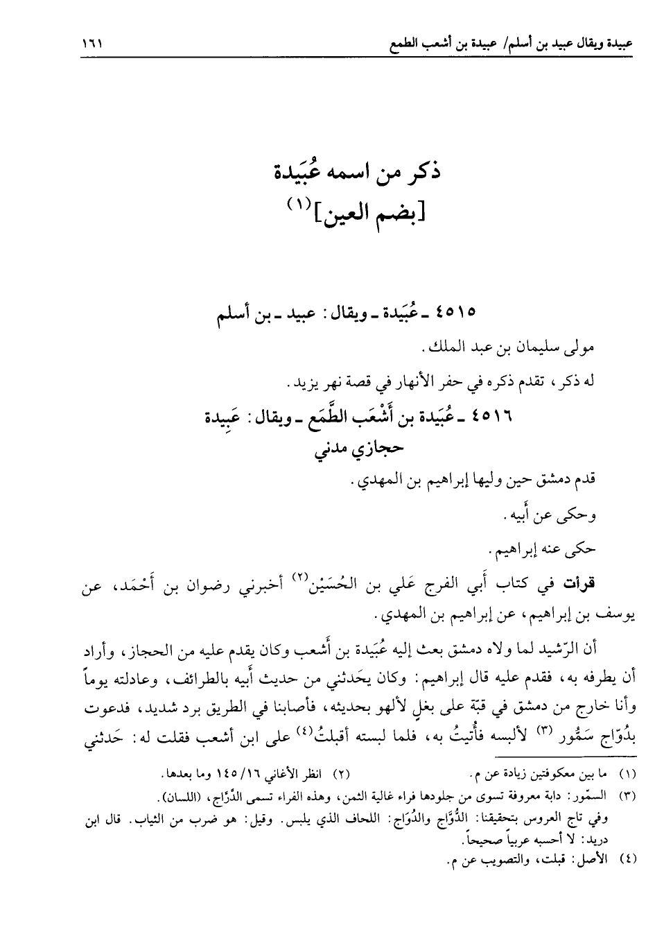 ذكر من اسمه عبيدة بضم العين (1) 4515 - عبيدة ويقال عبيد بن أسلم مولى سليمان بن عبد الملك له ذكر تقدم ذكره في حفر الأنهار في قصة نهر يزيد 4516 - عيبدة بن أشعب الطمع ويقال عبيدة حجازي مدني قدم دمشق حين وليها إبراهيم بن المهدي وحكى عن أبيه حكى عن إبراهيم قرأت في كتاب أبي الفرج علي بن الحسين (2) أخبرني رضوان بن أحمد عن يوسف بن إبراهيم عن إبراهيم بن المهدي أن الرشيد لما ولاه دمشق بعث إليه عبيدة بن أشعب وكان يقدم عليه من الحجاز وأراد أن يطرفه به فقدم عليه قال إبراهيم وكان يحدثني من حديث أبيه بالطرائف وعادلته يوما وأنا خارج من دمشق في قبة على بغل لألهو بحديثه فأصابنا في الطريق برد شديد فدعوت بدواج سمور (3) لألبسه فأتيت به فلما لبسته أقبلت (4) على ابن أشعب فقلت له حدثني