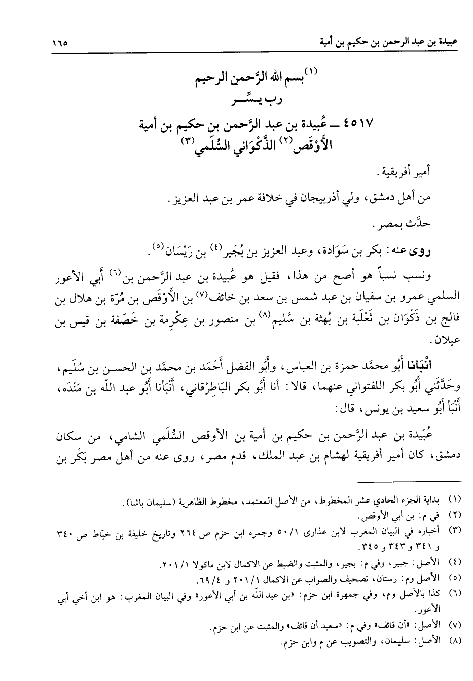 4517 - عبيدة بن عبد الرحمن بن حكيم بن أمية الأوقص (2) الذكواني السلمي (3) أمير أفريقية من أهل دمشق ولي أذربيجان في خلافة عمر بن عبد العزيز حدث بمصر روى عنه بكر بن سوادة وعبد العزيز بن بجير (4) بن ريسان (5) ونسب نسبا هو أصح من هذا فقيل هو عبيدة بن عبد الرحمن بن (6) أبي الأعور السلمي عمرو بن سفيان بن عبد شمس بن سعد بن خائف (7) بن الأوقص بن مرة بن هلال بن فالج بن ذكوان بن ثعلبة بن بهثة بن سليم (8) بن منصور بن عكرمة بن خصفة بن قيس بن عيلان أنبأنا أبو محمد حمزة بن العباس وأبو الفضل أحمد بن محمد بن الحسن بن سليم وحدثني أبو بكر اللفتواني عنهما قالا أنا أبو بكر الباطرقاني أنبأنا أبو عبد الله بن منده أنبأ أبو سعيد بن يونس قال عبيدة بن عبد الرحمن بن حكيم بن أمية بن الأوقص السلمي الشامي من سكان دمشق كان أمير أفريقية لهشام بن عبد الملك قدم مصر روى عنه من أهل مصر بكر بن