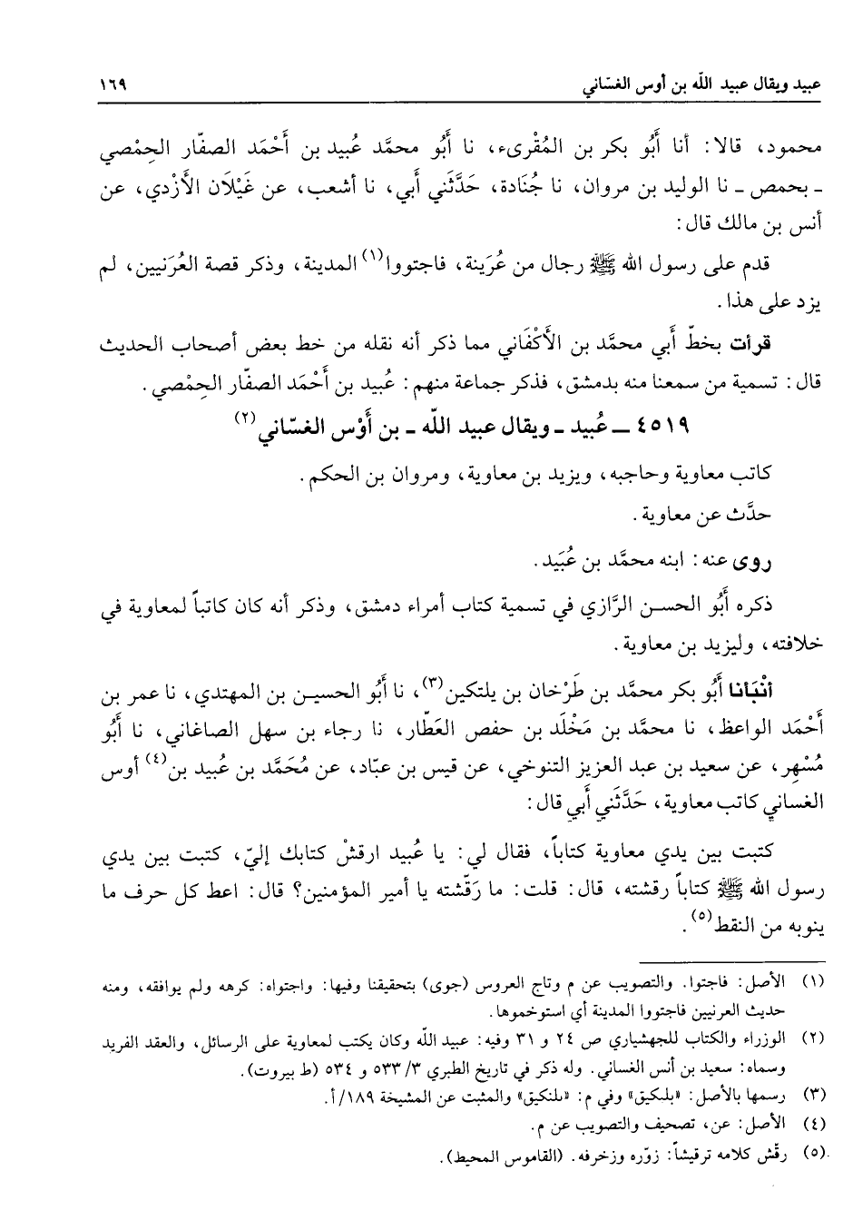 محمود قالا أنا أبو بكر بن المقرئ نا أبو محمد عبيد بن أحمد الصفار الحمصي بحمص نا الوليد بن مروان نا جنادة حدثني أبي نا أشعب عن غيلان الأزدي عن أنس بن مالك قال قدم على رسول الله (صلى الله عليه وسلم) رجال من عرينة فاجتووا (1) المدينة وذكر قصة العرنيين لم يزد على هذا قرأت بخط أبي محمد بن الأكفاني مما ذكر أنه نقله من خط بعض أصحاب الحديث قال تسمية من سمعنا منه بدمشق فذكر جماعة منهم عبيد بن أحمد الصفار الحمصي 4519 - عبيد ويقال عبيد الله بن أوس الغساني (2) كاتب معاوية وحاجبه ويزيد بن معاوية ومروان بن الحكم حدث عن معاوية روى عنه ابنه محمد بن عبيد ذكره أبو الحسن الرازي في تسمية كتاب أمراء دمشق وذكر أنه كان كاتبا لمعاوية في خلافته وليزيد بن معاوية أنبأنا أبو بكر محمد بن طرخان بن يلتكين (3) نا أبو الحسين بن المهتدي نا عمر بن أحمد الواعظ نا محمد بن مخلد بن حفص العطار نا رجاء بن سهل الصاغاني نا أبو مسهر عن سعيد بن عبد العزيز التنوخي عن قيس بن عباد عن محمد بن عبيد بن (4) أوس الغساني كاتب معاوية حدثني أبي قال كتبت بين يدي معاوية كتابا فقال لي يا عبيد ارقش كتابك إلى كتبت بين يدي رسول الله (صلى الله عليه وسلم) كتابا رقشته قال قلت ما رقشته يا أمير المؤمنين قال اعط كل حرف ما ينوبه من النقط (5)