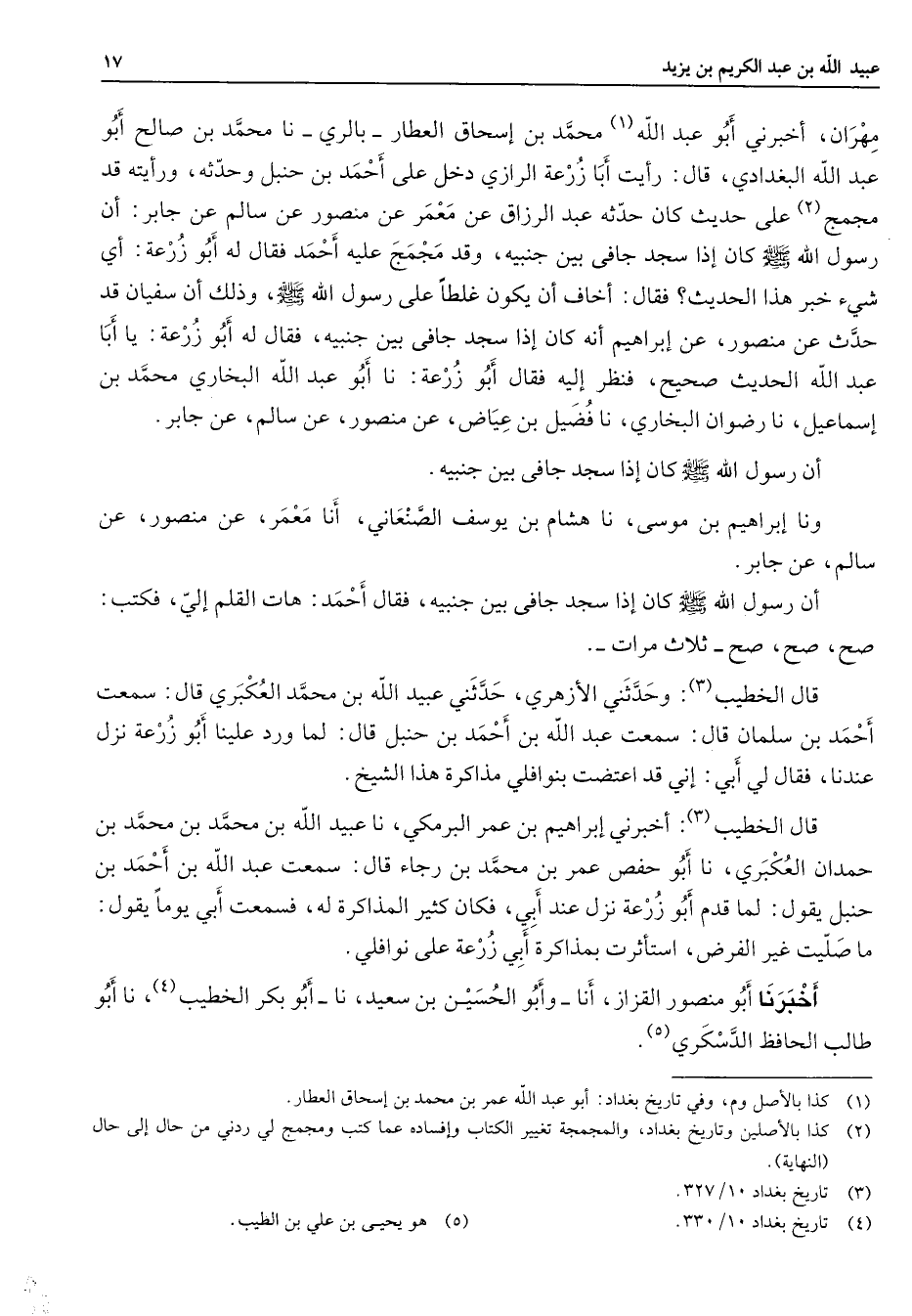 مهران أخبرني أبو عبد الله (1) محمد بن إسحاق العطار بالري نا محمد بن صالح أبو عبد الله البغدادي قال رأيت أبا زرعة الرازي دخل على أحمد بن حنبل وحدثه ورأيته قد مجمج (2) على حديث كان حدثه عبد الرزاق عن معمر عن منصور عن سالم عن جابر أن رسول الله (صلى الله عليه وسلم) كان إذا سجد جافى بين جنبيه وقد مجمج عليه أحمد فقال له أبو زرعة أي شئ خبر هذا الحديث فقال أخاف أن يكون غلطا على رسول الله (صلى الله عليه وسلم) وذلك أن سفيان قد حدث عن منصور عن إبراهيم أنه كان إذا سجد جافى بين جنبيه فقال له أبو زرعة يا أبا عبد الله الحديث صحيح فنظر إليه فقال أبو زرعة نا أبو عبد الله البخاري محمد بن إسماعيل نا رضوان البخاري نا فضيل بن عياض عن منصور عن سالم عن جابر أن رسول الله (صلى الله عليه وسلم) كان إذا سجد جافى بين جنبيه ونا إبراهيم بن موسى نا هشام بن يوسف الصنعاني أنا معمر عن منصور عن سالم عن جابر أن رسول الله (صلى الله عليه وسلم) كان إذا سجد جافى بين جنبيه فقال أحمد هات القلم إلي فكتب صح صح صح ثلاث مرات قال الخطيب (3) وحدثني الأزهري حدثني عبيد الله بن محمد العكبري قال سمعت أحمد بن سلمان قال سمعت عبد الله بن أحمد بن حنبل قال لما ورد علينا أبو زرعة نزل عندنا فقال لي أبي إني قد اعتضت بنوافلي مذاكرة هذا الشيخ قال الخطيب (3) أخبرني إبراهيم بن عمر البرمكي نا عبيد الله بن محمد بن محمد بن حمدان العكبري نا أبو حفص عمر بن محمد بن رجاء قال سمعت عبد الله بن أحمد بن حنبل يقول لما قدم أبو زرعة نزل عند أبي فكان كثير المذاكرة له فسمعت أبي يوما يقول ما صليت غير الفرض استأثرت بمذاكرة أبي زرعة على نوافلي أخبرنا أبو منصور القزاز أنا وأبو الحسين بن سعيد نا أبو بكر الخطيب (4) نا أبو طالب الحافظ الدسكري (5)