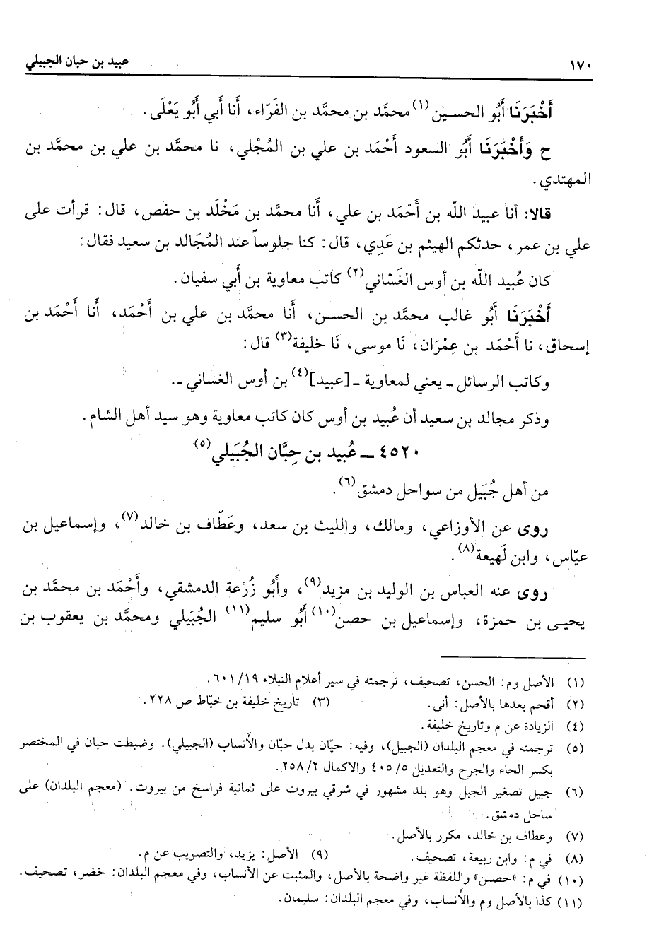 أخبرنا أبو الحسين (1) محمد بن محمد بن الفراء أنا أبي أبو يعلى ح وأخبرنا أبو السعود أحمد بن علي بن المجلي نا محمد بن علي بن محمد بن المهتدي قالا أنا عبيد الله بن أحمد بن علي أنا محمد بن مخلد بن حفص قال قرأت على علي بن عمر حدثكم الهيثم بن عدي قال كنا جلوسا عند المجالد بن سعيد فقال كان عبيد الله بن أوس الغساني (2) كاتب معاوية بن أبي سفيان أخبرنا أبو غالب محمد بن الحسن أنا محمد بن علي بن أحمد أنا أحمد بن إسحاق أنا أحمد بن عمران نا موسى نا خليفة (3) قال وكاتب الرسائل يعني لمعاوية عبيد (4) بن أوس الغساني وذكر مجالد بن سعيد أن عبيد بن أوس كان كاتب معاوية وهو سيد أهل الشام 4520 - عبيد بن حبان الجبيلي (5) من أهل جبيل من سواحل دمشق (6) روى عن الأوزاعي ومالك والليث بن سعد وعطاف بن خالد (7) وإسماعيل بن عياس وابن لهيعة (8) روى عنه العباس بن الوليد بن مزيد (9) وأبو زرعة الدمشقي وأحمد بن محمد بن يحيى بن حمزة وإسماعيل بن حصن (10) أبو سليم (11) الجبيلي ومحمد بن يعقوب بن