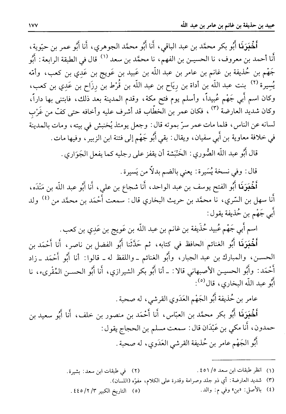 أخبرنا أبو بكر محمد بن عبد الباقي أنا أبو محمد الجوهري أنا أبو عمرو بن حيوية أنا أحمد بن معروف نا الحسين بن الفهم نا محمد بن سعد (1) قال في الطبقة الرابعة أبو جهم بن حذيفة بن غانم بن عامر بن عبد الله بن عويج بن عدي بن كعب وأمه يسيرة (2) بنت عبد الله بن أداة بن رياح بن عبد الله بن قرط بن رزاح بن عدي بن كعب وكان اسم أبي جهم عبيدا وأسلم يوم فتح مكة وقدم المدينة بعد ذلك فابتنى بها دارا وكان شديد العارضة (3) فكان عمر بن الخطاب قد أشرف عليه وأخافه حتى كف من غرب لسانه عن الناس فلما مات عمر سر بموته قال وجعل يومئذ يخنبش في بيته ومات بالمدينة في خلافة معاوية بن أبي سفيان ويقال بقي أبو جهم إلى فتنة ابن الزبير وفيها مات قال أبو عبد الله الصوري الخنبشة أن يقفز على رجليه كما يفعل الجواري قال وفي نسخة يسيرة يعني بالضم بدلا من يسيرة أخبرنا أبو الفتح يوسف بن عبد الواحد أنا شجاع بن علي أنا أبو عبد الله بن منده أنا سهل بن السري نا محمد بن حريث البخاري قال سمعت أحمد بن محمد من (4) ولد أبي جهم بن حذيفة يقول اسم أبي جهم عبيد حذيفة بن غانم بن عبد الله بن عويج بن عدي بن كعب أخبرنا أبو الغنائم الحافظ في كتابه ثم حدثنا أبو الفضل بن ناصر أنا أحمد بن الحسن والمبارك بن عبد الجبار وأبو الغنائم واللفظ له قالوا أنا أبو أحمد زاد أحمد وأبو الحسين الأصبهاني قالا أنا أبو بكر الشيرازي أنا أبو الحسن المقرئ نا أبو عبد الله البخاري قال (5) عامر بن حذيفة أبو الجهم العدوي القرشي له صحبة أخبرنا أبو بكر محمد بن العباس أنا أحمد بن منصور بن خلف أنا أبو سعيد بن حمدون أنا مكي بن عبدان قال سمعت مسلم بن الحجاج يقول أبو الجهم عامر بن حذيفة القرشي العدوي له صحبة
