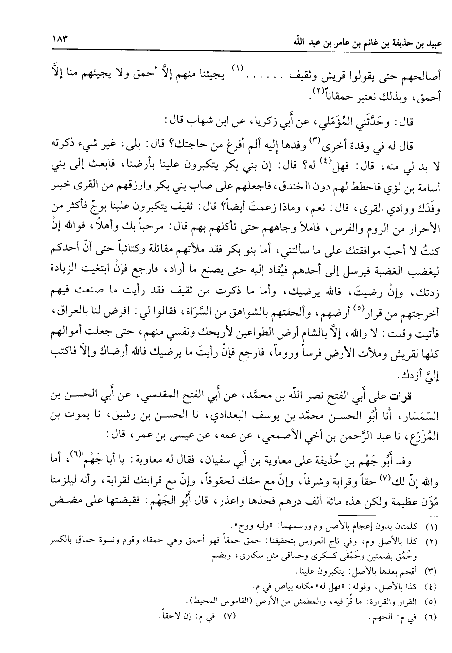 أصالحهم حتى يقولوا قريش وثقيف (1) يجيئنا منهم إلا أحمق ولا يجيئهم منا إلا أحمق وبذلك نعتبر حمقانا (2) قال وحدثني المؤملي عن أبي زكريا عن ابن شهاب قال قال له في وفدة أخرى (3) وفدها إليه ألم أفرغ من حاجتك قال بلى غير شئ ذكرته لا بد لي منه قال فهل (4) له قال إن بني بكر يتكبرون علينا بأرضنا فابعث إلى بني أسامة بن لؤي فاحطط لهم دون الخندق فاجعلهم على صاب بني بكر وارزقهم من القرى خيبر وفدك ووادي القرى قال نعم وماذا زعمت أيضا قال ثقيف يتكبرون علينا بوج فأكثر من الأحرار من الروم والفرس فاملأ وجاههم حتى تأكلهم بهم قال مرحبا بك وأهلا فوالله إن كنت لا أحب موافقتك على ما سألتني أما بنو بكر فقد ملأتهم مقاتلة وكتائبا حتى أن أحدكم ليغضب الغضبة فيرسل إلى أحدهم فيقاد إليه حتى يصنع ما أراد فارجع فإن ابتغيت الزيادة زدتك وإن رضيت فالله يرضيك وأما ما ذكرت من ثقيف فقد رأيت ما صنعت فيهم أخرجتهم من قرار (5) أرضهم وألحقتهم بالشواهق من السراة فقالوا لي افرض لنا بالعراق فأتيت فقلت لا والله إلا يالشام أرض الطواعين لأريحك ونفسي منهم حتى جعلت أموالهم كلها لقريش وملأت الأرض فرسا وروما فارجع فإن رأيت ما يرضيك فالله أرضاك وإلا فاكتب إلى أزدك قرأت على أبي الفتح نصر الله بن محمد عن أبي الفتح المقدسي عن أبي الحسن بن السمسار أنا أبو الحسن محمد بن يوسف البغدادي نا الحسن بن رشيق نا يموت بن المزرع نا عبد الرحمن بن أخي الأصمعي عن عمه عن عيسى بن عمر قال وفد أبو جهم بن حذيفة على معاوية بن أبي سفيان فقال له معاوية يا أبا جهم (6) أما والله إن لك (7) حقا وقرابة وشرفا وإن مع حقك لحقوقا وإن مع قرابتك لقرابة وأنه ليلزمنا مؤن عظيمة ولكن هذه مائة ألف درهم فخذها واعذر قال أبو الجهم فقبضتها على مضض