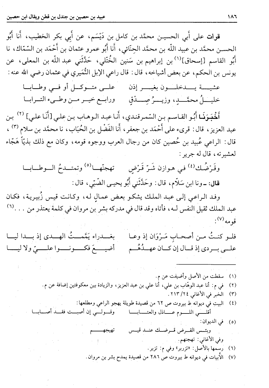 قرأت على أبي الحسين محمد بن كامل بن ديسم عن أبي بكر الخطيب أنا أبو الحسن محمد بن عبيد الله بن محمد الحنائي أنا أبو عمرو عثمان بن أحمد بن السماك نا أبو القاسم إسحاق (1) بن إبراهيم بن سنين الختلي حدثني عبد الله بن المعلى عن يونس بن الحكم عن بعض أشياخه قال قال راعي الإبل النميري في عثمان Bهـ * عشية يدخلون بغير إذن * على متوكل أو في وطابا خليل محمد وزير صدق * ورابع خير من وطئ الترابا * أخبرنا أبو القاسم بن السمرقندي أنا عبد الوهاب بن علي أنا علي (2) بن عبد العزيز قال قرئ على أحمد بن جعفر أنا الفضل بن الحباب نا محمد بن سلام (3) قال الراعي عبيد بن حصين كان من رجال العرب ووجوه قومه وكان مع ذلك بذيا هجاء لعشيرته قال له جرير * وقرضك (4) في هوازن شر قرض * تهجنها (5) وتمتدح الوطابا * قال ونا ابن سلام قال وحدثني أيو يحيى الضبي قال وفد الراعي إلى عبد الملك يشكو بعض عمال له وكانت قيس زبيرية فكان عبد الملك ثقيل النفس له فأتاه وقد قال في مدركه بشر بن مروان في كلمة يعتذر من (6) قومه (7) * فلو كنت من أصحاب مروان إذ وعا * بغدراء يممت الهدى إذ بدا ليا على بردى إذ قال إن كان عهدهم * أضيع فكونوا علي ولا ليا