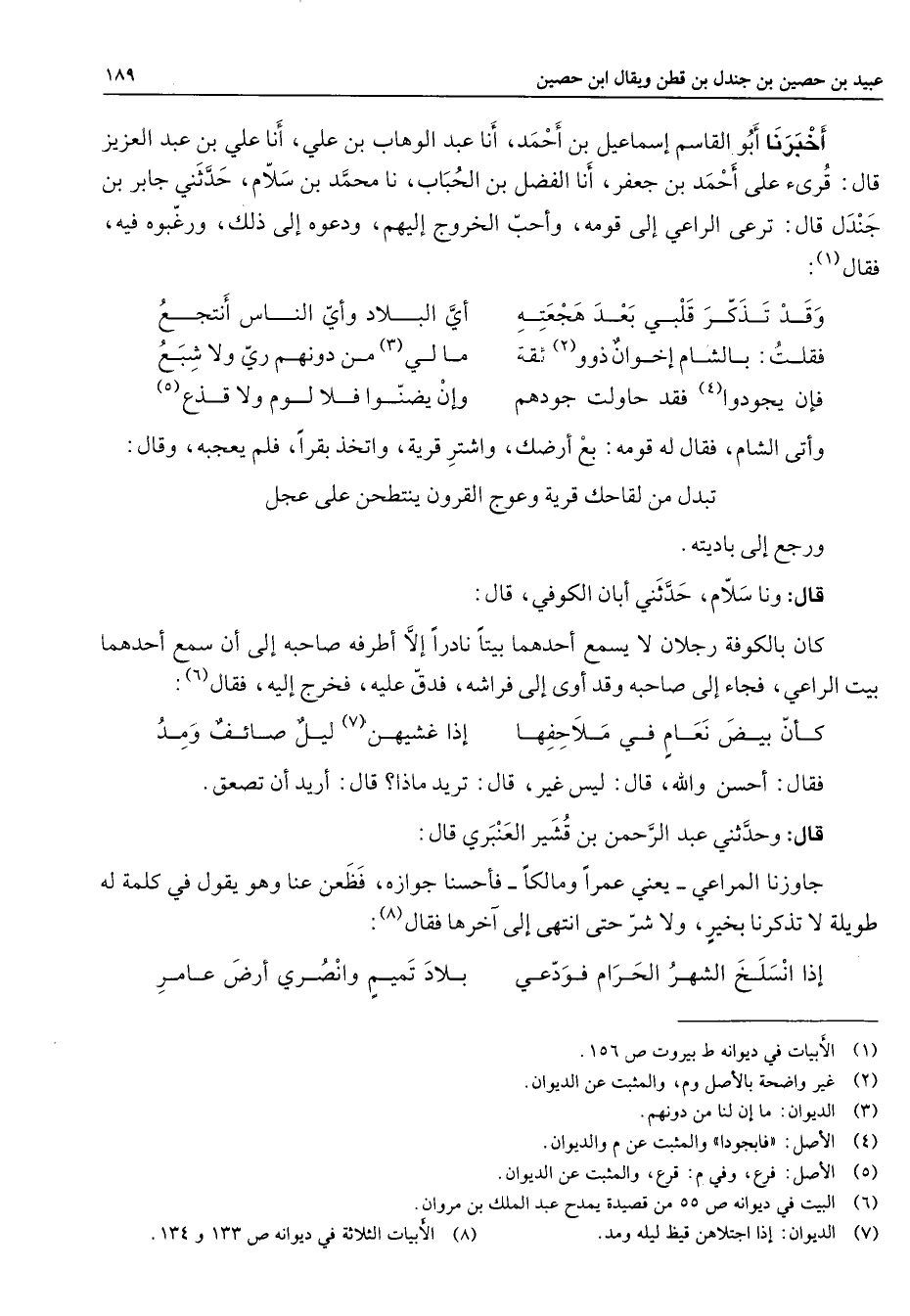 أخبرنا أبو القاسم إسماعيل بن أحمد أنا عبد الوهاب بن علي أنا علي بن عبد العزيز قال قرئ على أحمد بن جعفر أنا الفضل بن الحباب نا محمد بن سلام حدثني جابر بن جندل قال ترعى الراعي إلى قومه وأحب الخروج إليهم ودعوه إلى ذلك ورغبوه فيه فقال (1) * وقد تذكر قلبي بعد هجعته * أي البلاد وأي الناس أنتجع فقلت بالشام إخوان ذوو (2) ثقة * مالي (3) من دونهم ري ولا شبع فإن يجودوا (4) فقد حاولت جودهم * وإن يضنوا فلا لوم ولا قذع (5) * وأتى الشام فقال له قومه بع أرضك واشتر قرية واتخذ بقرا فلم يعجبه وقال تبدل من لقاحك قرية وعوج القرون ينتطحن على عجل ورجع إلى باديته قال ونا سلام حدثني أبان الكوفي قال كان بالكوفة رجلان لا يسمع أحدهما بيتا نادرا إلا أطرفه صاحبه إلى أن سمع أحدهما بيت الراعي فجاء إلى صاحبه وقد أوى إلى فراشه فدق عليه فخرج إليه فقال (6) * كأن بيض نعام في ملاحفها * إذا غشيهن (7) ليل صائف ومد * فقال أحسن والله قال ليس غير قال تريد ماذا قال أريد أن تصعق قال وحدثني عبد الرحمن بن قشير العنبري قال جاوزنا المراعي يعني عمرا ومالكا فأحسنا جوازه فظعن عنا وهو يقول في كلمة له طويلة لا تذكرنا بخير ولا شر حتى انتهى إلى آخرها فقال (8) * إذا انسلخ الشهر الحرام فودعي * بلاد تميم وانصري أرض عامر
