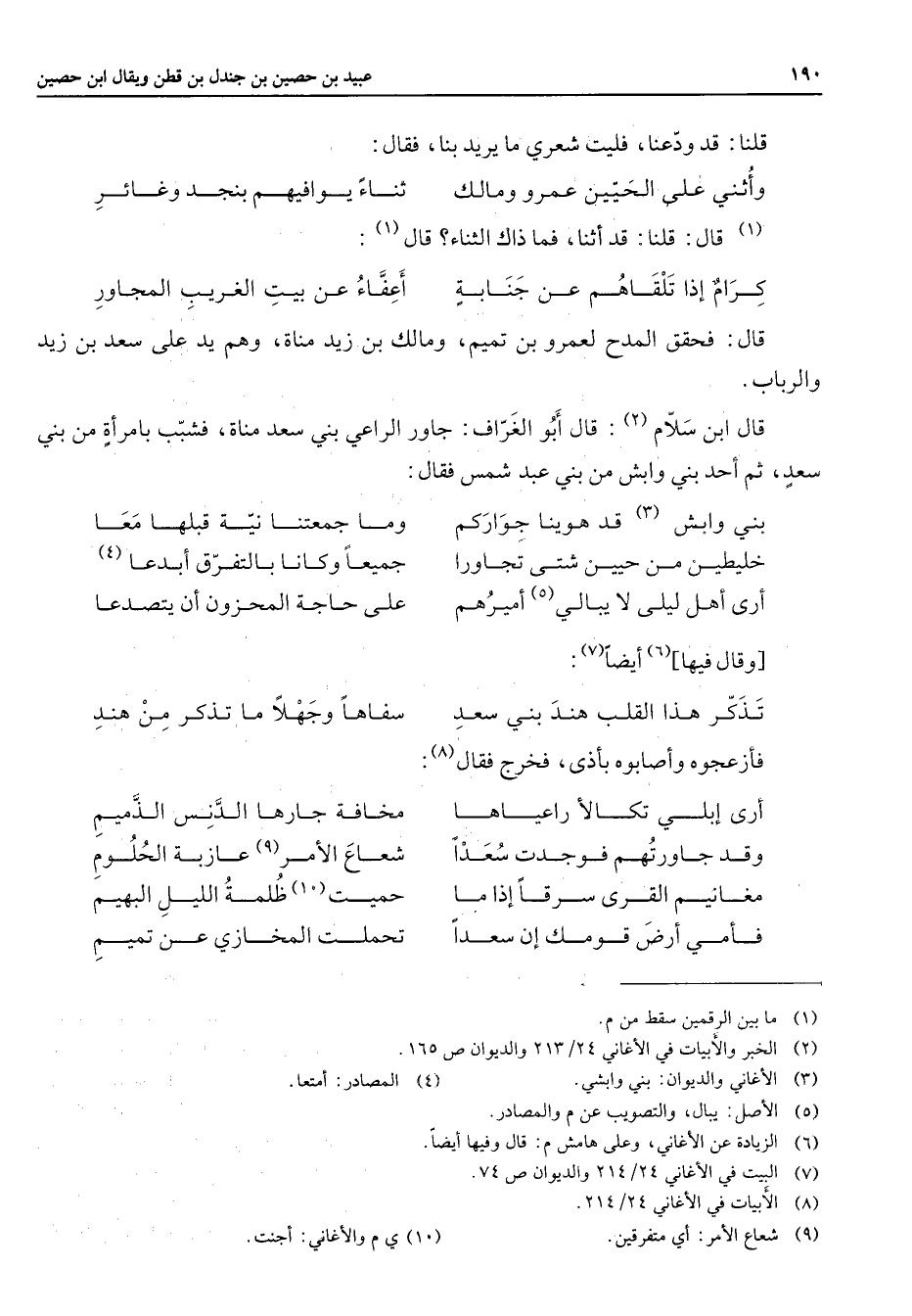 قلنا قد ودعنا فليت شعري ما يريد بنا فقال * وأثني على الحيين عمرو ومالك * ثناء يوافيهم بنجد وغائر * (1) قال قلنا قد أثنا فما ذاك الثناء قال (1) * كرام إذا تلقاهم عن جنابة * أعفاء عن بيت الغريب المجاور * قال فحقق المدح لعمرو بن تميم ومالك بن زيد مناة وهم يد على سعد بن زيد والرباب قال ابن سلام (2) قال أبو الغراف جاور الراعي بني سعد مناة فشبب بإمرأة من بني سعد ثم أحد بني وابش من بني عبد شمس فقال * بني وابش (3) قد هوينا جواركم * وما جمعتنا نية قبلها معا خليطين من حيين شتى تجاورا * جميعا وكانا بالتفرق أبدعا (4) أرى أهل ليلى لا يبالي (5) أميرهم * على حاجة المحزون أن يتصدعا * وقال فيها (6) أيضا (7) * تذكر هذا القلب هند بني سعد * سفاها وجهلا ما تذكر من هند * فأزعجوه وأصابوه بأذى فخرج فقال (8) * أرى إبلي تكالأ راعياها * مخافة جارها الدنس الذميم وقد جاورتهم فوجدت سعدا * شعاع الأمر (9) عازبة الحلوم مغانيم القرى سرقا إذا ما * حميت (10) ظلمة الليل البهيم فأمي أرض قومك إن سعدا * تحملت المخازي عن تميم