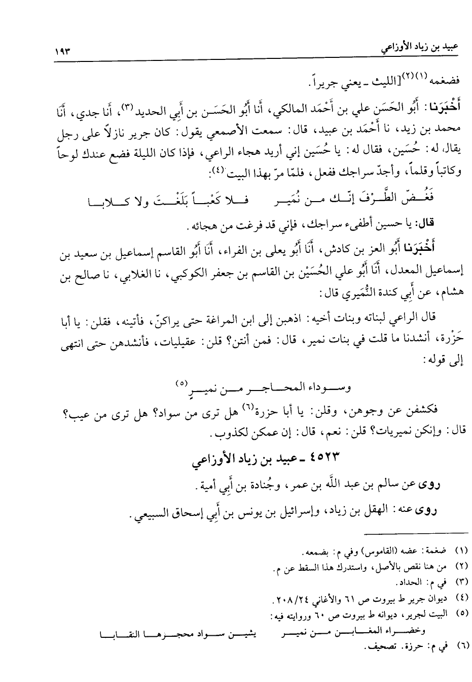 فضغمه (1) (2) الليث يعني جريرا أخبرنا أبو الحسن علي بن أحمد المالكي أنا أبو الحسن بن أبي الحديد (3) أنا جدي أنا محمد بن زيد نا أحمد بن عبيد قال سمعت الأصمعي يقول كان جرير نازلا على رجل يقال له حسين فقال له يا حسين إني أريد هجاء الراعي فإذا كان الليلة فضع عندك لوحا وكاتبا وقلما وأجد سراجك ففعل فلما مر بهذا البيت (4) * فغض الطرف إنك من نمير * فلا كعبا بلغت ولا كلابا * قال يا حسين أطفئ سراجك فإني قد فرغت من هجائه أخبرنا أبو العز بن كادش أنا أبو يعلى بن الفراء أنا أبو القاسم إسماعيل بن سعيد بن إسماعيل المعدل أنا أبو علي الحسين بن القاسم بن جعفر الكوكبي نا الغلابي نا صالح بن هشام عن أبي كندة النميري قال قال الراعي لبناته وبنات أخيه اذهبن إلى ابن المراغة حتى يراكن فأتينه فقلن يا أبا حزرة أنشدنا ما قلت في بنات نمير قال فمن أنتن قلن عقيليات فأنشدهن حتى انتهى إلى قوله * وسوداء المحاجر من نمير (5) فكشفن عن وجوههن وقلن يا أبا حزرة (6) هل ترى من سواد هل ترى من عيب قال وإنكن نميريات قلن نعم قال إن عمكن لكذوب 4523 - عبيد بن زياد الأوزاعي روى عن سالم بن عبد الله بن عمر وجنادة بن أبي أمية روى عنه الهقل بن زياد وإسرائيل بن يونس بن أبي إسحاق السبيعي