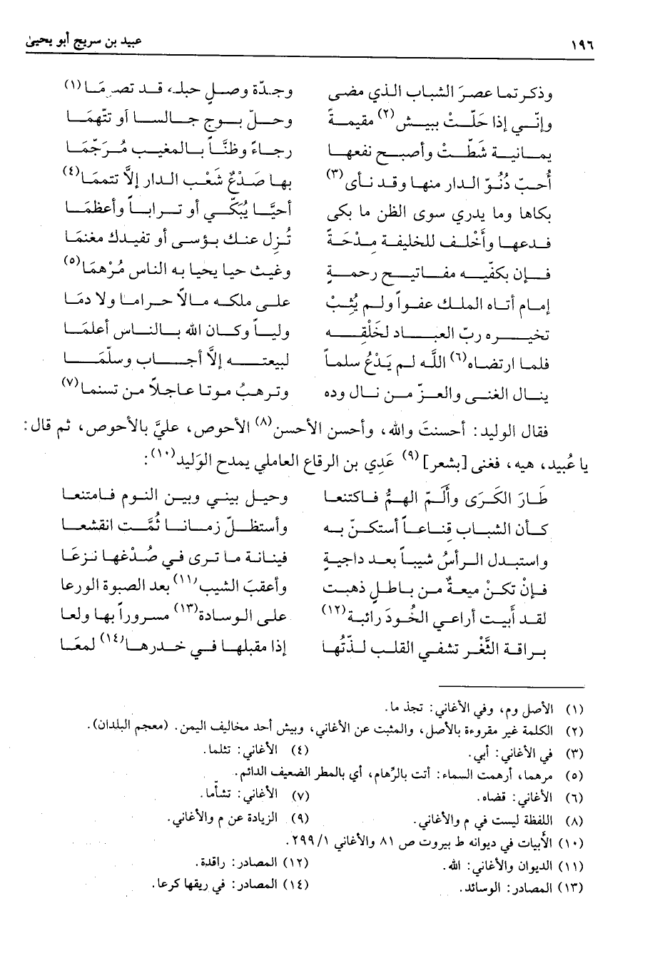 أحب دنو الدار منها وقد نأى (3) * بها صدع شعب الدار إلا تتمما (4) بكاها وما يدري سوى الظن ما بكى * أحيا يبكي أو ترابا وأعظما فدعها وأخلف للخليفة مدحة * تزل عنك بؤسى أو تفيدك مغنما فإن بكفيه مفاتيح رحمة * وغيث حيا يحيا به الناس مرهما (5) إمام أتاه الملك عفوا ولم يثب * على ملكه مالا حراما ولا دما تخيره رب العباد لخلقه * وليا وكان الله بالناس أعلما فلما ارتضاه (6) الله لم يدع سلما * لبيعته إلا أجاب وسلما ينال الغنى والعز من نال وده * وترهب موتا عاجلا من تسنما (7) * فقال الوليد أحسنت والله وأحسن الأحسن (8) الأحوص علي بالأحوص ثم قال يا عبيد هيه فغنى بشعر (9) عدي بن الرقاع العاملي يمدح الوليد (10) * طار الكرى وألم الهم فاكتنعا * وحيل بيني وبين النوم فامتنعا كأن الشباب قناعا أستكن به * وأستظل زمانا ثمت انقشعا واستبدل الرأس شيبا بعد داجية * فينانة ما ترى في صدغها نزعا فإن تكن ميعة من باطل ذهبت * وأعقب الشيب (11) بعد الصبورة الورعا لقد أبيت أراعي الخود رائبة (12) * على الوسادة (13) مسرورا بها ولعا براقة الثغر تشفي القلب لذتها * إذا مقبلها في خدرها (14) لمعا