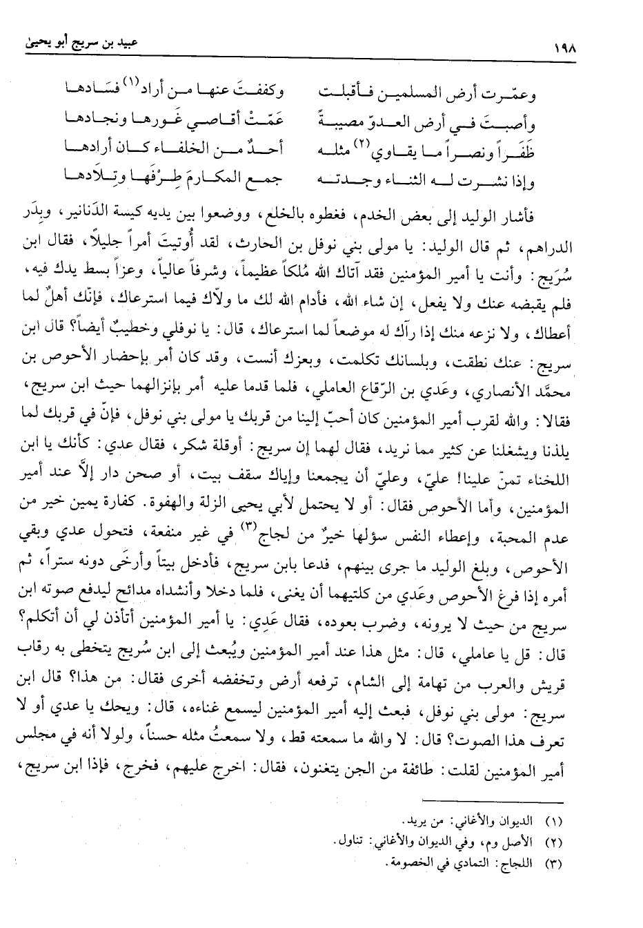 وعمرت أرض المسلمين فأقبلت * وكففت عنها من أراد (1) فسادها وأصبت في أرض العدو مصيبة * عمت أقاصي غورها ونجادها ظفر ونصرا ما يقاوي (2) مثله * أحد من الخلفاء كان أرادها وإذا نشرت له الثناء وجدته * جمع المكارم طرفها وتلادها * فأشار الوليد إلى بعض الخدم فغطوه بالخلع ووضعوا بين يديه كيسة الدنانير وبدر الدراهم ثم قال الوليد يا مولى بني نوفل بن الحارث لقد أوتيت أمرا جليلا فقال ابن سريج وأنت يا أمير المؤمنين فقد آتاك الله ملكا عظيما وشرفا عاليا وعزا بسط يدك فيه فلم يقبضه عنك ولا يفعل إن شاء الله فأدام الله لك ما ولاك فيما استرعاك فإنك أهل لما أعطاك ولا نزعه منك إذا رآك موضعا لما استرعاك قال يا نوفلي وخطيب أيضا قال ابن سريج عنك نطقت وبلسانك تكلمت وبعزك أنست وقد كان أمر بإحضار الأحوص بن محمد الأنصاري وعدي بن الرقاع العاملي فلما قدما عليه أمر بإنزالهما حيث ابن سريج فقالا والله لقرب أمير المؤمنين كان أحب إلينا من قربك يا مولى بني نوفل فإن في قربك لما يلذنا ويشغلنا عن كثير مما نريد فقال لهما ان سريج أو قل شكر فقال عدي كأنك يا ابن اللخناء تمن علينا علي وعلي أن يجمعنا وإياك سقف بيت أو صحن دار إلا عند أمير المؤمنين وأما الأحوص فقال أو لا يحتمل لأبي يحيى الزلة والهفوة كفارة يمين خير من عدم المحبة وإعطاء النفس سؤلها خير من لجاج (3) في غير منفعة فتحول عدي وبقي الأحوص وبلغ الوليد ما جرى بينهم فدعا بابن سريج فأدخل بيتا وأرخى دونه سترا ثم أمره إذا فرغ الأحوص وعدي من كلتيهما أن يغني فلما دخلا وأنشداه مدائح ليدفع صوته ابن سريج من حيث لا يرونه وضرب بعوده فقال عدي يا أمير المؤمنين أتأذن لي أن أتكلم قال قل يا عاملي قال مثل هذا عند أمير المؤمنين ويبعث إلى ابن سريج يتخطى به رقاب قريش والعرب من تهامة إلى الشام ترفعه أرض وتخفضه أخرى فقال من هذا قال ابن سريج مولى بني نوفل فبعث إليه أمير المؤمنين ليسمع غناءه قال ويحك يا عدي أولا تعرف هذا الصوت قال لا والله ما سمعته قط ولا سمعت مثله حسنا ولولا أنه في مجلس أمير المؤمنين لقلت طائفة من الجن يتغنون فقال اخرج عليهم فخرج فإذا ابن سريج