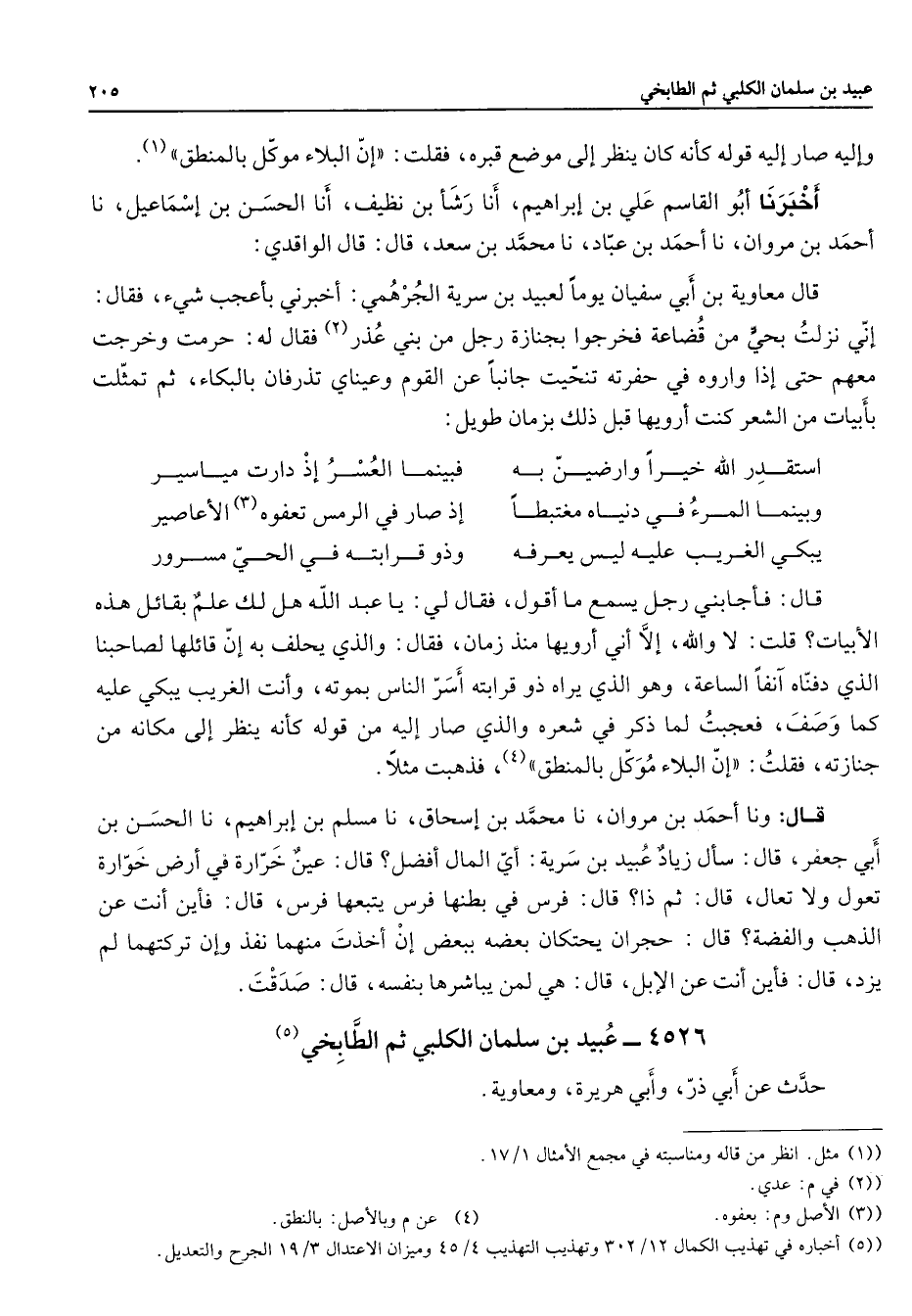 وإليه صار إليه قوله كأنه كان ينظر إلى موضع قبره فقلت إن البلاء موكل بالمنطق (1) أخبرنا أبو القاسم علي بن إبراهيم أنا رشأ بن نظيف أنا الحسن بن إسماعيل نا أحمد بن مروان نا أحمد بن عباد نا محمد بن سعد قال قال الواقدي قال معاوية بن أبي سفيان يوما لعبيد بن سرية الجرهمي أخبرني بأعجب شئ فقال إني نزلت بحي من قضاعة فخرجوا بجنازة رجل من بني عذر (2) فقال له حرمت وخرجت معهم حتى إذا واروه في حفرته تنحيت جانبا عن القوم وعيناي تذرفان بالبكاء ثم تمثلت بأبيات من الشعر كنت أرويها قبل ذلك بزمان طويل * استقدر الله خيرا وارضين به * فبينما العسر إذ دارت مياسير وبينما المرء في دنياه مغتبطا * إذ صار في الرمس تعفوه (3) الأعاصير يبكي الغريب عليه ليس يعرفه * وذو قرابته في الحي مسرور * قال فأجابني رجل يسمع ما أقول فقال لي يا عبد الله هل لك علم بقائل هذه الأبيات قلت لا والله إلا أني أرويها منذ زمان فقال والذي يحلف به إن قائلها لصاحبنا الذي دفناه آنفا الساعة وهو الذي يراه ذو قرابته أسر الناس بموته وأنت الغريب يبكي عليه كما وصف فعجبت لما ذكر في شعره والذي صار إليه من قوله كأنه ينظر إلى مكانه من جنازته فقلت إن البلاء موكل بالمنطق (4) فذهبت مثلا قال وأنا أحمد بن مروان نا محمد بن إسحاق نا مسلم بن إبراهيم نا الحسن بن أبي جعفر قال سأل زياد عبيد بن سرية أي المال أفضل قال عين خرارة في أرض خوارة تعول ولا تعال قال ثم ذا قال فرس في بطنها فرس يتبعها فرس قال فأين أنت عن الذهب والفضة قال حجران يحتكان بعضه ببعض إن أخذت منهما نفذ وإن تركتهما لم يزد قال فأين أنت عن الإبل قال هي لمن يباشرها بنفسه قال صدقت 4526 - عبيد بن سلمان الكلبي ثم الطابخي (5) حدث عن أبي ذر وأبي هريرة ومعاوية