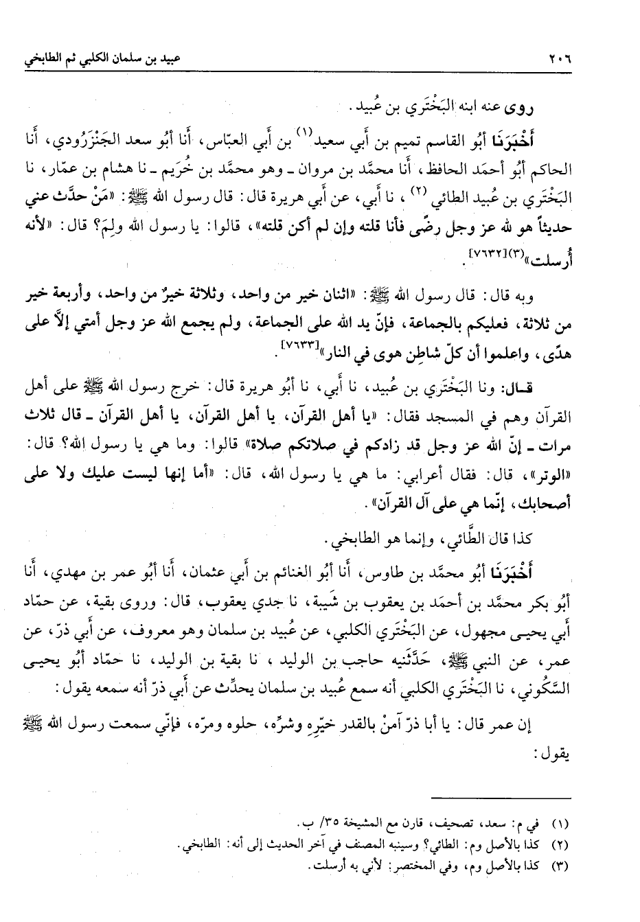 [7633] قال ونا البختر ي بن عبيد نا أبي نا أبو هريرة قال خرج رسول الله (صلى الله عليه وسلم) على أهل القرآن وهم في المسجد فقال يا أهل القرآن يا أهل القرآن يا أهل القرآن قال ثلاث مرات إن الله عز وجل قد زادكم في صلاتكم صلاة قالوا وما هي يا رسول الله قال الوتر قال فقال أعرابي ما هي يا رسول الله قال أما إنها ليست عليك ولا على أصحابك إنما هي على آل القرآن كذا قال الطائي وإنما هو الطابخي أخبرنا أبو محمد بن طاوس أنا أبو الغنائم بن أبي عثمان أنا أبو عمر بن مهدي أنا أبو بكر محمد بن أحمد بن يعقوب بن شيبة أنا جدي يعقوب قال وروى بقية عن حماد أبي يحيى مجهول عن البختري الكلبي عن عبيد بن سلمان وهو معروف عن أبي ذر عن عمر عن النبي (صلى الله عليه وسلم) حدثنيه حاجب بن الوليد نا بقية بن الوليد نا حماد أبو يحيى السكوني نا البختري الكلبي أنه سمع عبيد بن سلمان يحدث عن أبي ذر أنه سمعه يقول إن عمر قال يا أبا ذر آمن بالقدر خيره وشره حلوه ومره فإني سمعت رسول الله (صلى الله عليه وسلم) يقول
