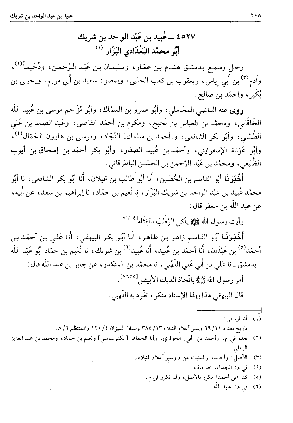 4527 - عبيد بن عبد الواحد بن شريك أبو محمد البغدادي البزاز (1) رحل وسمع بدمشق هشام بن عمار وسليمان بن عبد الرحمن ودحيما (2) وآدم (3) بن أبي إياس ويعقوب بن كعب الحلبي وبمصر سعيد بن أبي مريم ويحيى بن بكير وأحمد بن صالح روى عنه القاضي المحاملي وأبو عمرو بن السماك وأبو مزاحم موسى بن عبيد الله الخاقاني ومحمد بن العباس بن نجيح ومكرم بن أحمد القاضي وعبد الصمد بن علي الطستي وأبو بكر الشافعي وأحمد بن سلمان النجاد وموسى بن هارون الحمال (4) وأبو عوانة الإسفرايني وأحمد بن عبيد الصفار وأبو بكر أحمد بن إسحاق بن أيوب الضبعي ومحمد بن عبد الرحمن بن الحسن الباطرقاني أخبرنا أبو القاسم بن الحصين أنا أبو طالب بن غيلان أنا أبو بكر الشافعي نا أبو محمد عبيد بن عبد الواحد بن شريك البزار نا نعيم بن حماد نا إبراهيم بن سعد عن أبيه عن عبد الله بن جعفر قال رأيت رسول الله (صلى الله عليه وسلم) يأكل الرطب بالقثاء