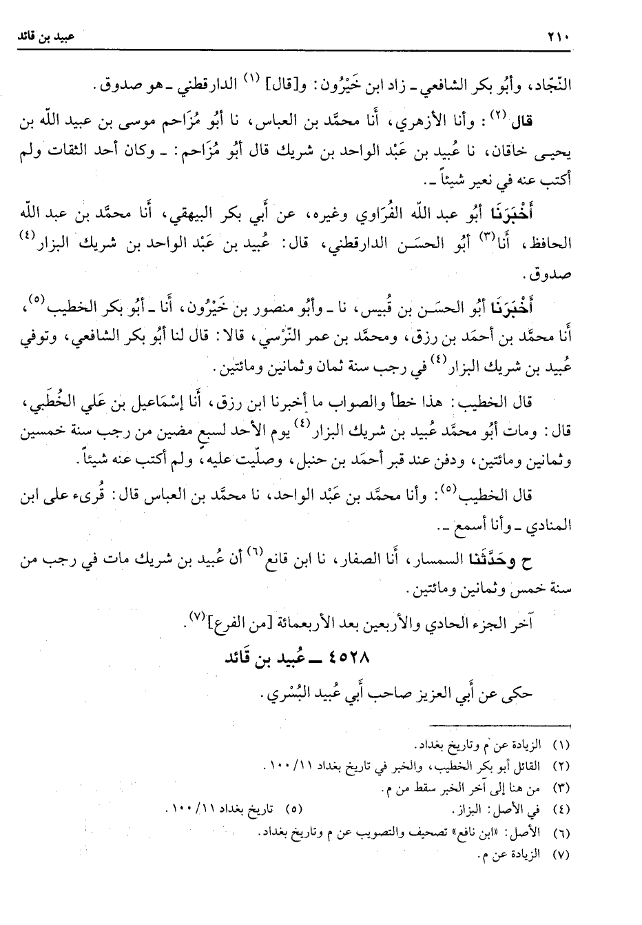 النجاد وأبو بكر الشافعي زاد ابن خيرون وقال (1) الدارقطني هو صدوق قال (2) وأنا الأزهري أنا محمد بن العباس نا أبو مزاحم موسى بن عبيد الله بن يحيى خاقان نا عبيد بن عبد الواحد بن شريك قال أبو مزاحم وكان أحد الثقات ولم أكتب عنه في نعير شيئا أخبرنا أبو عبد الله الفراوي وغيره عن أبي بكر البيهقي أنا محمد بن عبد الله الحافظ أنا (3) أبو الحسن الدارقطني قال عبيد بن عبد الواحد بن شريك البزار (4) صدوق أخبرنا أبو الحسن بن قبيس نا وأبو منصور بن خيرون أنا أبو بكر الخطيب (5) أنا محمد بن أحمد بن رزق ومحمد بن عمر النرسي قالا قال لنا أبو بكر الشافعي وتوفي عبيد بن شريك البزار (4) في رجب سنة ثمان وثمانين ومائتين قال الخطيب هذا خطأ والصواب ما أخبرنا ابن رزق أنا إسماعيل بن علي الخطبي قال ومات أبو محمد عبيد بن شريك البزار (4) يوم الأحد لسبع مضين من رجب سنة خمسين وثمانين ومائتين ودفن عند قبر أحمد بن حنبل وصليت عليه ولم أكتب عنه شيئا قال الخطيب (5) وأنا محمد بن عبد الواحد نا محمد بن العباس قال قرئ على ابن المنادي وأنا أسمع ح وحدثنا السمسار نا الصفار أنا ابن قانع (6) أن عبيد بن شريك مات في رجب من سنة خمس وثمانين ومائتين آخر الجزء الحادي والأربعين بعد الأربعمائة من الفرع (7) 4528 - عبيد بن قائد حكى عن أبي العزيز صاحب أبي عبيد البسري