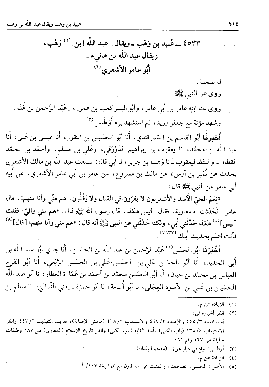 4533 - عبيد بن وهب ويقال عبد الله بن (1) وهب ويقال عبد الله بن هانئ أبو عامر الأشعري (2) له صحبة روى عن النبي (صلى الله عليه وسلم) روى عنه ابنه عامر بن أبي عامر وأبو اليسر كعب بن عمرو وعبد الرحمن بن غنم وشهد مؤتة مع جعفر وزيد ثم استشهد يوم أوطاس (3) أخبرنا أبو القاسم بن السمرقندي أنا أبو الحسين بن النقور أنا عيسى بن علي أنا عبد الله بن محمد نا يعقوب بن إبراهيم الدورقي وعلي بن مسلم وأحمد بن محمد القطان واللفظ ليعقوب نا وهب بن جرير نا أبي قال سمعت عبد الله بن مالك الأشعري يحدث عن نمير بن أوس عن مالك بن مسروح عن عامر بن أبي عامر الأشعري عن أبيه أبي عامر عن النبي (صلى الله عليه وسلم) قال نعم الحي الأسد والأشعريون لا يفرون في القتال ولا يغلون هم مني وأنا منهم قال عامر فحدثت به معاوية فقال ليس هكذا قال رسول الله (صلى الله عليه وسلم) قال هم مني وإلي فقلت ليس (4) هكذا حدثني أبي ولكنه حدثني عن النبي (صلى الله عليه وسلم) أنه قال هم مني وأنا منهم قال (8) فأنت أعلم بحديث أبيك