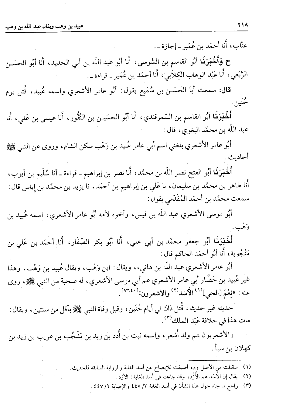 عتاب أنا أحمد بن عمير إجازة ح وأخبرنا أبو القاسم بن السوسي أنا أبو عبد الله بن أبي الحديد أنا أبو الحسن الربعي أنا عبد الوهاب الكلابي أنا أحمد بن عمير قراءة قال سمعت أبا الحسن بن سميع يقول أبو عامر الأشعري واسمه عبيد قتل يوم حنين أخبرنا أبو القاسم بن السمرقندي أنا أبو الحسين بن النقور أنا عيسى بن علي أنا عبد الله بن محمد البغوي قال أبو عامر الأشعري بلغني اسم أبي عامر عبيد بن وهب سكن الشام وروى عن النبي (صلى الله عليه وسلم) أحاديث أخبرنا أبو الفتح نصر الله بن محمد أنا نصر بن إبراهيم قراءة أنا سليم بن أيوب أنا طاهر بن محمد بن سليمان نا علي بن إبراهيم بن أحمد نا يزيد بن محمد بن إياس قال سمعت محمد بن أحمد المقدمي يقول أبو موسى الأشعري عبد الله بن قيس وأخوه لأمه أبو عامر الأشعري اسمه عبيد بن وهب أخبرنا أبو جعفر محمد بن أبي علي أنا أبو بكر الصفار أنا أحمد بن علي بن منجوية أنا أبو أحمد الحاكم قال أبو عامر الأشعري عبد الله بن هانئ ويقال ابن وهب ويقال عبيد بن وهب وهذا غير عبيد بن حضار أبي عامر الأشعري عم أبي موسى الأشعري له صحبة من النبي (صلى الله عليه وسلم) روى عنه نعم الحي (1) الأسد (2) والأشعرون