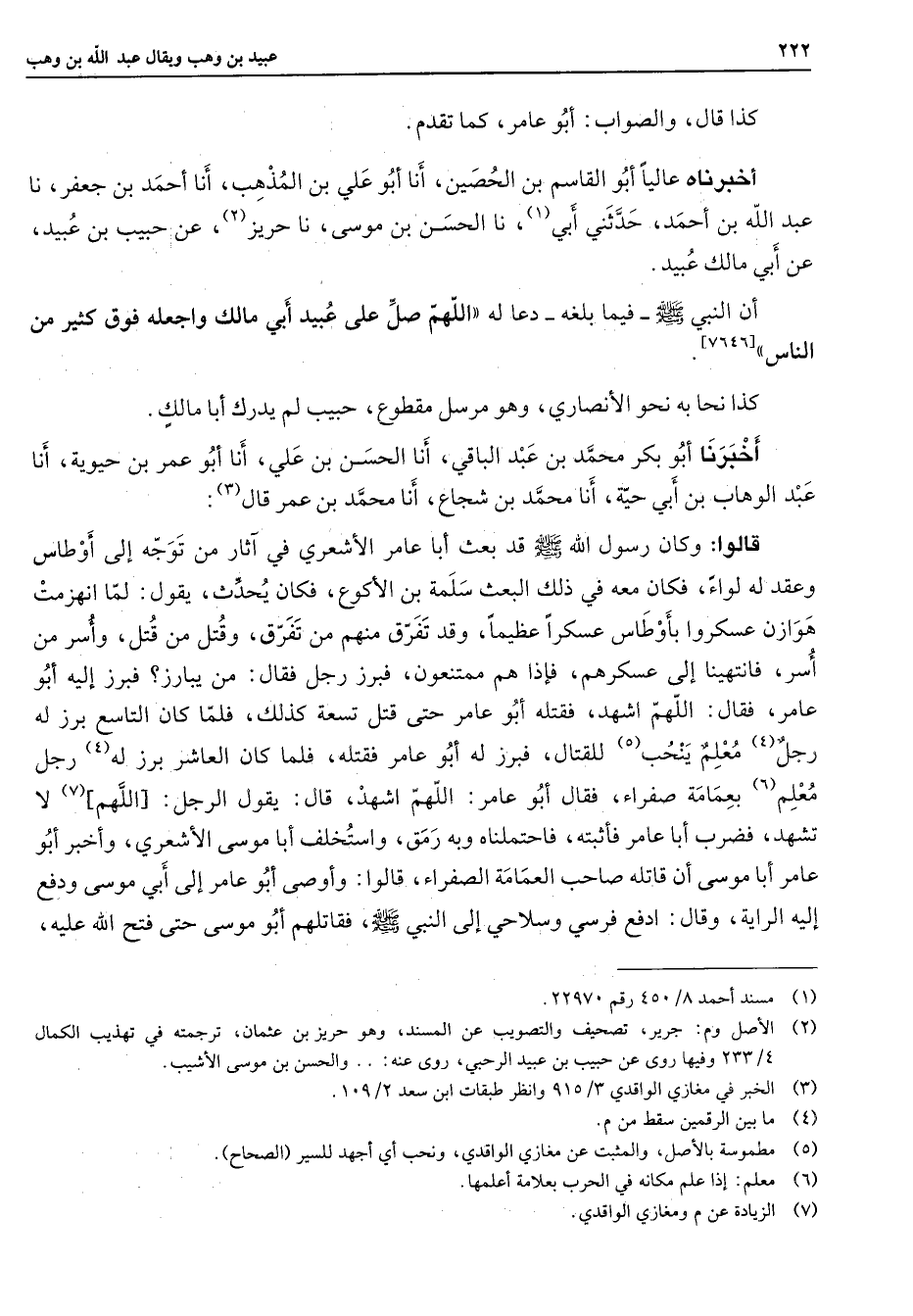 [7646] كذا نحا به نحو الأنصاري وهو مرسل مقطوع حبيب لم يدرك أبا مالك أخبرنا أبو بكر محمد بن عبد الباقي أنا الحسن بن علي أنا أبو عمر بن حيوية أنا عبد الوهاب بن أبي حية أنا محمد بن شجاع أنا محمد بن عمر قال (3) قالوا وكان رسول الله (صلى الله عليه وسلم) قد بعث أبا عامر الأشعري في آثار من توجه إلى أوطاس وعقد له لواء فكان معه في ذلك البعث سلمة بن الأكوع فكان يحدث يقول لما انهزمت هوازن عسكروا بأوطاس عسكرا عظيما وقد تفرق منهم من تفرق وقتل من قتل وأسر من أسر فانتهينا إلى عسكرهم فإذا هم ممتنعون فبرز رجل فقال من يبارز فبرز إليه أبو عامر فقال اللهم اشهد فقتله أبو عامر حتى قتل تسعة كذلك فلما كان التاسع برز له رجل (4) معلم ينحب (5) للقتال فبرز له أبو عامر فقتله فلما كان العاشر برز له (4) رجل معلم (6) بعمامة صفراء فقال أبو عامر اللهم اشهد قال يقول الرجل اللهم (7) لا تشهد فضرب أبا عامر فأثبته فاحتملناه وبه رمق واستخلف أبا موسى الأشعري وأخبر أبو عامر أبا موسى أنا قاتله صاحب العمامة الصفراء قالوا وأوصى أبو عامر إلى أبي موسى ودفع إليه الراية وقال ادفع فرسي وسلاحي إلى النبي (صلى الله عليه وسلم) فقاتلهم أبو موسى حتى فتح الله عليه