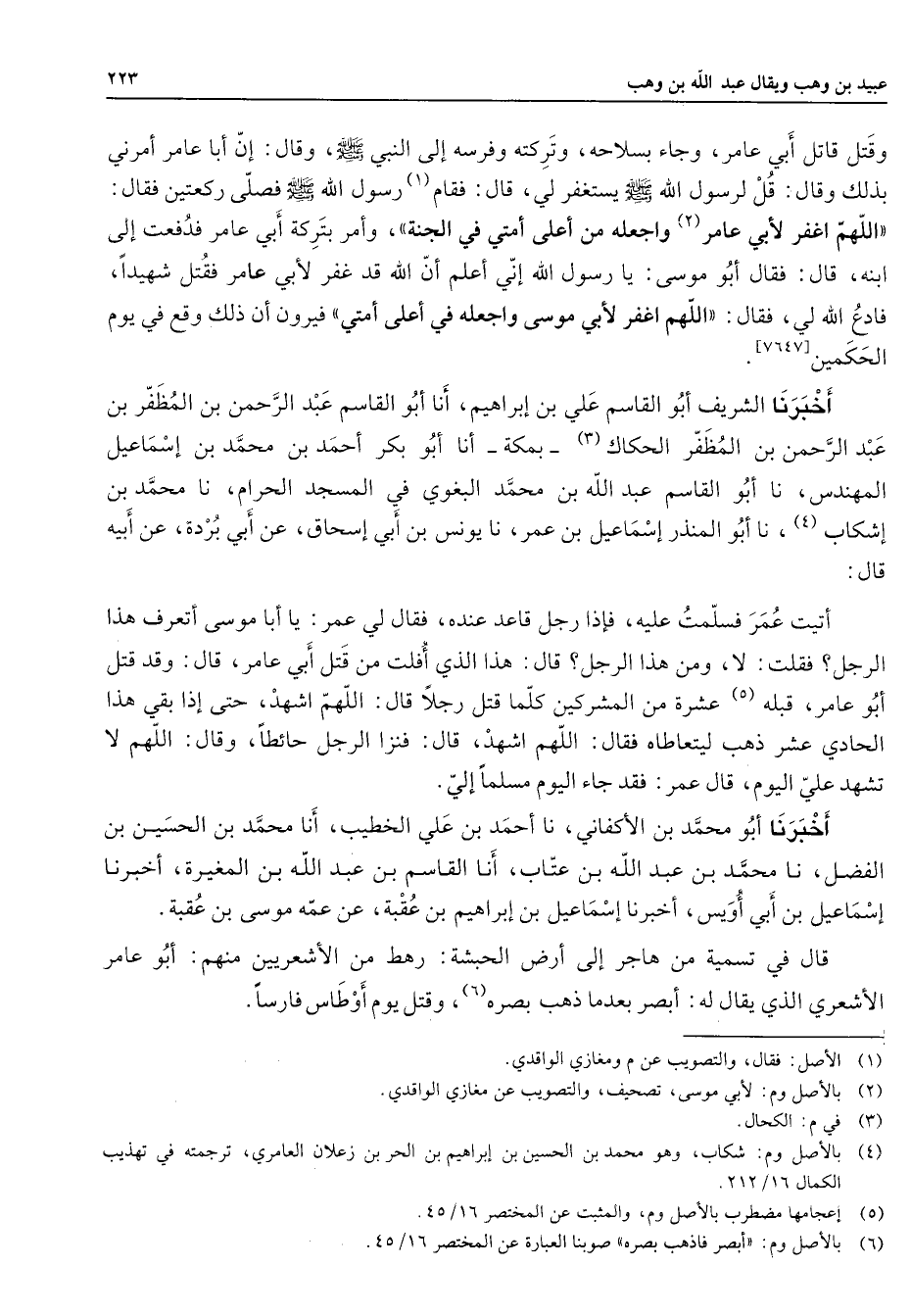 [7647] أخبرنا الشريف أبو القاسم على بن إبراهيم أنا أبو القاسم عبد الرحمن بن المظفر بن عبد الرحمن بن المظفر الحكاك (3) بمكة أنا أبو بكر أحمد بن محمد بن إسماعيل المهندس نا أبو القاسم عبد الله بن محمد البغوي في المسجد الحرام نا محمد بن إشكاب (4) نا أبو المنذر إسماعيل بن عمر نا يونس بن أبي إسحاق عن أبي بردة عن أبيه قال أتيت عمر فسلمت عليه فإذا رجل قاعد عنده فقال لي عمر يا أبا موسى أتعرف هذا الرجل فقلت لا ومن هذا الرجل قال هذا الذي أفلت من قتل أبي عامر قال وقد قتل أبو عامر قبله (5) عشرة من المشركين كلما قتل رجلا قال اللهم اشهد حتى إذا بقي هذا الحادي عشر ذهب ليتعاطاه فقال اللهم اشهد قال فنزا الرجل حائطا وقال اللهم لا تشهد علي اليوم قال عمر فقد جاء اليوم مسلما إلي أخبرنا أبو محمد بن الأكفاني نا أحمد بن علي الخطيب أنا محمد بن الحسين بن الفضل نا محمد بن عبد الله بن عتاب أنا القاسم بن عبد الله بن المغيرة أخبرنا إسماعيل بن أبي أويس أخبرنا إسماعيل بن إبراهيم بن عقبة عن عمه موسى بن عقبة قال في تسمية من هاجر إلى أرض الحبشة رهط من الأشعريين منهم أبو عامر الأشعري الذي قال له أبصر بعدما ذهب بصره (6) وقتل يوم أوطاس فارسا