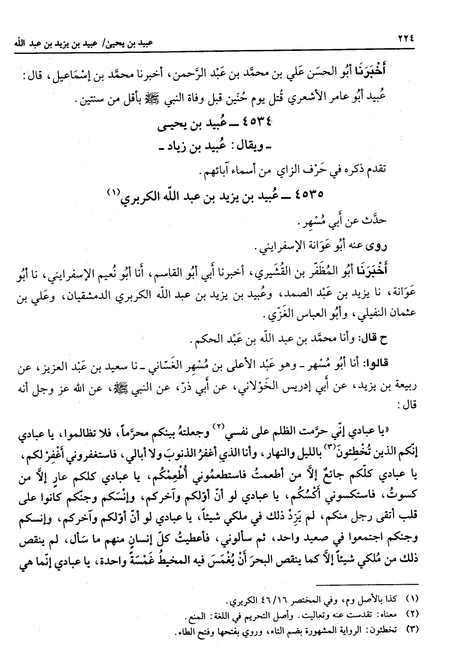 أخبرنا أبو الحسن علي بن محمد بن عبد الرحمن أخبرنا محمد بن إسماعيل قال عبيد أبو عامر الأشعري قتل يوم حنين قبل وفاة النبي (صلى الله عليه وسلم) بأقل من سنتين 4534 - عبيد بن يحيى ويقال عبيد بن زياد تقدم ذكره في حرف الزاي من أسماء آبائهم 4535 - عبيد بن يزيد بن عبد الله الكربري (1) حدث عن أبي مسهر روى عنه أبو عوانة الإسفرايني أخبرنا أبو المظفر بن القشيري أخبرنا أبي أبو القاسم أنا أبو نعيم الإسفرايني نا أبو عوانة نا يزيد بن عبد الصمد وعبيد بن يزيد بن عبد الله بن الكربري الدمشقيان وعلي بن عثمان النفيلي وأبو العباس الغزي ح قال وأنا محمد بن عبد الله بن عبد الحكم قالوا أنا أبو مسهر وهو عبد الأعلى بن مسهر الغساني نا سعيد بن عبد العزيز عن ربيعة بن يزيد عن أبي إدريس الخولاني عن أبي ذر عن النبي (صلى الله عليه وسلم) عن الله عز وجل أنه قال يا عبادي إني حرمت الظلم على نفسي (2) وجعلته بينكم محرما فلا تظالموا يا عبادي إنكم الذين تخطئون (3) بالليل والنهار وأنا الذي أغفر الذنوب ولا أبالي فاستغفروني أغفر لكم يا عبادي كلكم جائع إلا من أطعمت فاستطعموني أطعمكم يا عبادي كلكم عار إلا من كسوت فاستكسوني أكسكم يا عبادي لو أن أولكم وآخركم وإنسكم وجنكم كانوا على قلب أتقى رجل منكم لم يزد ذلك في ملكي شيئا يا عبادي لو أن أولكم وآخركم وإنسكم وجنكم اجتمعوا في صعيد واحد ثم سألوني فأعطيت كل إنسان منهم ما سأل لم ينقص ذلك من ملكي شيئا إلا كما ينقص البحر أن يغمس فيه المخيط غمسة واحدة يا عبادي إنما هي