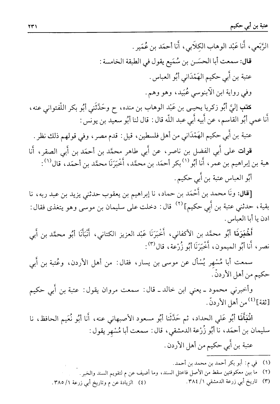 الربعي أنا عبد الوهاب الكلابي أنا أحمد بن عمير قال سمعت أبا الحسن بن سميع يقول في الطبقة الخامسة عتبة بن أبي حكيم الهمداني أبو العباس وفي رواية ابن الآبنوسي عبيد وهو وهم كتب إلي أبو زكريا يحيى بن عبد الوهاب بن منده وحدثني أبو بكر اللفتواني عنه أنا عمي أبو القاسم عن أبيه أبي عبد الله قال قال لنا أبو سعيد بن يونس عتبة بن أبي حكيم الهمداني من أهل فلسطين قيل قدم مصر وفي قولهم ذلك نظر قرأت على أبي الفضل بن ناصر عن أبي طاهر محمد بن أحمد بن أبي الصقر أنا هبة بن إبراهيم بن عمر أنا أبو (1) بكر أحمد بن محمد أخبرنا محمد بن أحمد قال (1) أبو العباس عتبة بن أبي حكيم قال ونا محمد بن أحمد بن حماد نا إبراهيم بن يعقوب حدثني يزيد بن عبد ربه نا بقية حدثني عتبة بن أبي حكيم (2) قال دخلت على سليمان بن موسى وهو يتغذى فقال ادن يا أبا العباس أخبرنا أبو محمد بن الأكفاني أخبرنا عبد العزيز الكتاني أنبأنا أبو محمد بن أبي نصر أنا أبو الميمون أخبرنا أبو زرعة قال (3) سمعت أبا مسهر يسأل عن موسى بن يسار فقال من أهل الأردن وعتبة بن أبي حكيم من أهل الأردن وأخبرني محمود يعني ابن خالد قال سمعت مروان يقول عتبة بن أبي حكيم ثقة (4) من أهل الأردن أنبأنا أبو علي الحداد ثم حدثنا أبو مسعود الأصبهاني عنه أنا أبو نعيم الحافظ نا سليمان بن أحمد نا أبو زرعة الدمشقي قال سمعت أبا مسهر يقول عتبة بن أبي حكيم من أهل الأردن