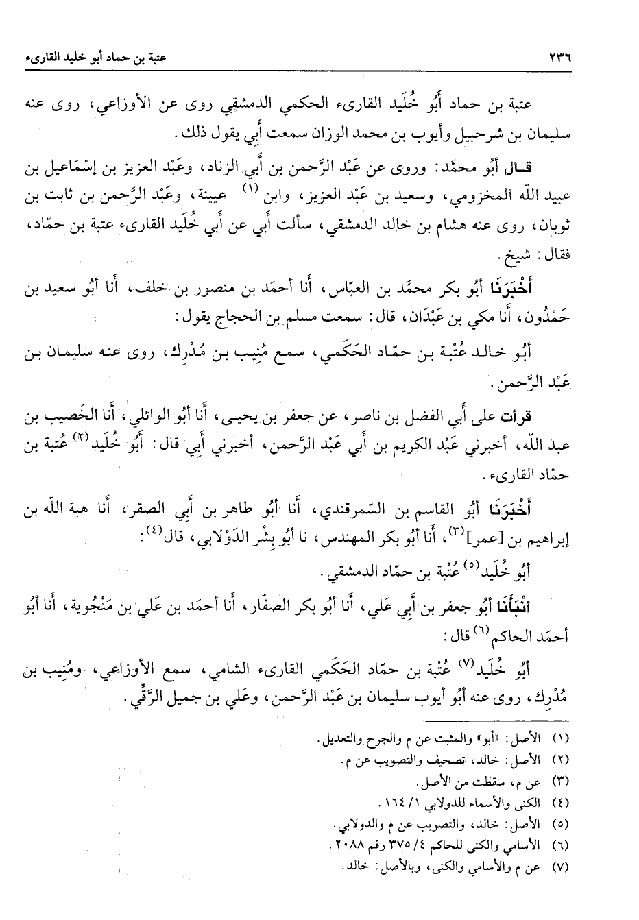 عتبة بن حماد أبو خليد القارئ الحكمي الدمشقي روى عن الأوزاعي روى عنه سليمان بن شرحبيل وأيوب بن محمد الوزان سمعت أبي يقول ذلك قال أبو محمد وروى عن عبد الرحمن بن أبي الزناد وعبد العزيز بن إسماعيل بن عبيد الله المخزومي وسعيد بن عبد العزيز وابن (1) عيينة وعبد الرحمن بن ثابت بن ثوبان روى عنه هشام بن خالد الدمشقي سألت أبي عن أبي خليد القارئ عتبة بن حماد فقال شيخ أخبرنا أبو بكر محمد بن العباس أنا أحمد بن منصور بن خلف أنا أبو سعيد بن حمدون أنا مكي بن عبدان قال سمعت مسلم بن الحجاج يقول أبو خالد عتبة بن حماد الحكمي سمع منيب بن مدرك روى عنه سليمان بن عبد الرحمن قرأت على أبي الفضل بن ناصر عن جعفر بن يحيى أنا أبو الوائلي أنا الخصيب بن عبد الله أخبرني عبد الكريم بن أبي عبد الرحمن أخبرني أبي قال أبو خليد (2) عتبة بن حماد القارئ أخبرنا أبو القاسم بن السمرقندي أنا أبو طاهر بن أبي الصقر أنا هبة الله بن إبراهيم بن عمر (3) أنا أبو بكر المهندس نا أبو بشر الدولابي قال (4) أبو خليد (5) عتبة بن حماد الدمشقي أنبأنا أبو جعفر بن أبي علي أنا أبو بكر الصفار أنا أحمد بن علي بن منجوية أنا أبو أحمد الحاكم (6) قال أبو خليد (7) عتبة بن حماد الحكمي القارئ الشامي سمع الأوزاعي ومنيب بن مدرك روى عنه أبو أيوب سليمان بن عبد الرحمن وعلي بن جميل الرقي