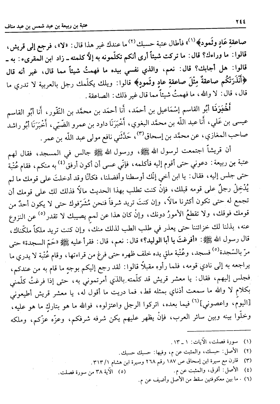 صاعقة عاد وثمود " (1) فأطال عتبة حسبك (2) ما عندك غير هذا قال لا فرجع إلى قريش قالوا ما وراءك قال ما تركت شيئا أرى أنكم تكلمونه به إلا كلمته زاد ابن المقرئ به قالوا هل أجابك قال نعم والذي نفسي بيده ما فهمت شيئا مما قال غير أنه قال أنذرتكم صاعقة مثل صاعقة عاد وثمود " قالوا ويلك يكلمك رجل بالعربية لا تدري ما قال قال لا والله ما فهمت شيئا مما قال غير ذلك الصاعقة أخبرنا أبو القاسم إسماعيل بن أحمد أنا أحمد بن محمد بن النقور أنا أبو القاسم عيسى بن علي أنا عبد الله بن محمد البغوي أخبرنا داود بن عمرو الضبي أخبرنا أبو راشد صاحب المغازي عن محمد بن إسحاق (3) حدثني نافع مولى عبد الله بن عمر أن قريشا اجتمعت لرسول الله (صلى الله عليه وسلم) ورسول الله (صلى الله عليه وسلم) جالس في المسجد فقال لهم عتبة بن ربيعة دعوني حتى أقوم إليه فأكلمه فإني عسى أن أكون أرفق (4) به منكم فقام عتبة حتى جلس إليه فقال يا ابن أخي إنك أوسطنا وأفضلنا فكأنا وقد أدخلت على قومك ما لم يدخل رجل على قومه قبلك فإن كنت تطلب بهذا الحديث مالا فذلك لك على قومك أن تجمع له حتى تكون أكثرنا مالا وإن كنت تريد شرفا فنحن مشرفوك حتى لا يكون أحد من قومك فوقك ولا تقطع الأمور دونك وإن كان هذا عن لمم يصيبك لا تقدر (5) عن النزوع عنه بذلنا لك خزائننا حتى يعذر في طلب الطب لذلك منك وإن كنت تريد ملكا ملكناك قال رسول الله (صلى الله عليه وسلم) أفرغت يا أبا الوليد قال نعم قال فقرأ عليه الصلاة والسلام " حم السجدة " حتى مر بالسجدة (5) فسجد وعتبة ملق يده خلف ظهره حتى فرغ من قراءتها وقام عتبة لا يدري ما يراجعه به إلى نادي قومه فلما رأوه مقبلا قالوا لقد رجع إليكم بوجه ما قام به من عندكم فجلس إليهم فقال يا معشر قريش قد كلمته بالذي أمرتموني به حتى إذا فرغت كلمني بكلام لا والله ما سمعت أذناي بمثله قط فما دريت ما أقول له يا معشر قريش أطيعوني اليوم واعصوني فيما بعده اتركوا الرجل واعتزلوه فوالله ما هو بتارك ما هو عليه وخلوا بينه وبين سائر العرب فإن يظهر عليهم يكن شرفه شرفكم وعزه عزكم وملكه