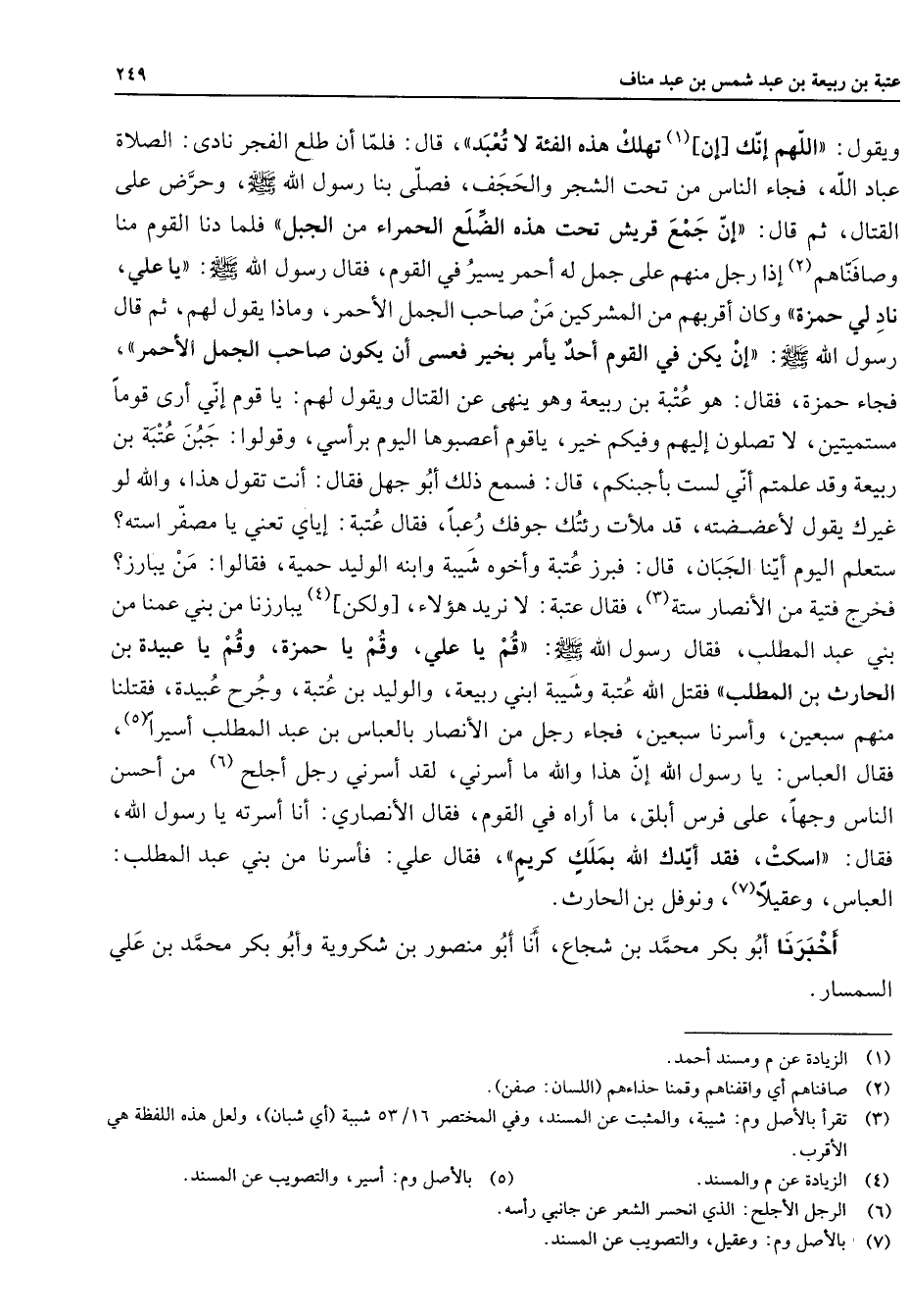 ويقول اللهم إنك إن (1) تهلك هذه الفئة لا تعبد قال فلما أن طلع الفجر نادى الصلاة عباد الله فجاء الناس من تحت الشجر والحجف فصلى بنا رسول الله (صلى الله عليه وسلم) وحرض على القتال ثم قال إن جمع قريش تحت هذه الضلع الحمراء من الجبل فلما دنا القوم منا وصافناهم (2) إذا رجل منهم على جمل له أحمر يسير في القوم فقال رسول الله (صلى الله عليه وسلم) يا علي ناد لي حمزة وكان أقربهم من المشركين من صاحب الجمل الأحمر وماذا يقول لهم ثم قال رسول الله (صلى الله عليه وسلم) إن يكن في القوم أحد يأمر بخير فعسى أن يكون صاحب الجمل الأحمر فجاء حمزة فقال هو عتبة بن ربيعة وهو ينهى عن القتال ويقول لهم يا قوم إني أرى قوما مستميتين لا تصلون إليهم وفيكم خير يا قوم أعصبوها اليوم برأسي وقولوا جبن عتبة بن ربيعة وقد علمتم أني لست بأجبنكم قال فسمع ذلك أبو جهل فقال أنت تقول هذا والله لو غيرك يقول لأعضضته قد ملأت رئتك جوفك رعبا فقال عتبة إياي تعني يا مصفر استه ستعلم اليوم أينا الجبان قال فبرز عتبة وأخوه شيبة وابنه الوليد حمية فقالوا من يبارز فخرج فتية من الأنصار ستة (3) فقال عتبة لا نريد هؤلاء ولكن (4) يبارزنا من بني عمنا من بني عبد المطلب فقال رسول الله (صلى الله عليه وسلم) قم يا علي وقم يا حمزة وقم يا عبيدة بن الحارث بن المطلب فقتل الله عتبة وشيبة ابني ربيعة والوليد بن عتبة وجرح عبيدة فقتلنا منهم سبعين وأسرنا سبعين فجاء رجل من الأنصار بالعباس بن عبد المطلب أسيرا (5) فقال العباس يا رسول الله إن هذا والله ما أسرني لقد أسرني رجل أجلح (6) من أحسن الناس وجها على فرس أبلق ما أراه في القوم فقال الأنصاري أنا أسرته يا رسول الله فقال اسكت فقد أيدك الله بملك كريم فقال علي فأسرنا من بني عبد الملطلب العباس وعقيلا (7) ونوفل بن الحارث أخبرنا أبو بكر محمد بن شجاع أنا أبو منصور بن شكروية وأبو بكر محمد بن علي السمسار