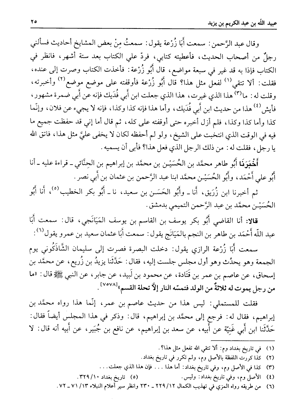 وقال عبد الرحمن سمعت أبا زرعة يقول سمعت من بعض المشايخ أحاديث فسألني رجل من أصحاب الحديث فأعطيته كتابي فرد علي الكتاب بعد ستة أشهر فانظر في الكتاب فإذا به قد غير في سبع مواضع قال أبو زرعة فأخذت الكتاب وصرت إلى عنده فقلت ألا تتقي (1) لفعل مثل هذا قال أبو زرعة فأوقفته على موضع موضع (2) وأخبرته وقلت له ما (3) هذا الذي غيرت هذا الذي جعلت ابن أبي فديك فإنه عن أبي ضمرة مشهور فأيش (4) هذا من حديث ابن أبي فديك وأما هذا فإنه كذا وكذا فإنه لا يجئ عن فلان وإنما كذا وأما كذا وكذا فلم أزل أخبره حتى أوقفته على كله ثم قال أما إني قد حفظت جميع ما فيه في الوقت الذي انتخبت على الشيخ ولو لم أحفظه لكان لا يخفى علي مثل هذا فاتق الله يا رجل فقلت له من ذلك الرجل الذي فعل هذا فأبى أن يسميه أخبرنا أبو طاهر محمد بن الحسين بن محمد بن إبراهيم بن الحنائي قراءة عليه أنا أبو علي أحمد وأبو الحسين محمد ابنا عبد الرحمن بن عثمان بن أبي نصر ثم أخبرنا ابن زريق أنا وأبو الحسن بن سعيد نا أبو بكر الخطيب (5) أنا أبو الحسين محمد بن عبد الرحمن التميمي بدمشق قالا أنا القاضي أبو بكر يوسف بن القاسم بن يوسف الميانجي قال سمعت أبا عبد الله أحمد بن طاهر بن النجم بالميانج يقول سمعت أبا عثمان سعيد بن عمرو يقول (6) سمعت أبا زرعة الرازي يقول دخلت البصرة فصرت إلى سليمان الشاذكوني يوم الجمعة وهو يحدث وهو أول مجلس جلست إليه فقال حدثنا يزيد بن زريع عن محمد بن إسحاق عن عاصم بن عمر بن قتادة عن محمود بن لبيد عن جابر عن النبي (صلى الله عليه وسلم) قال ما من رجل يموت له ثلاثة من الولد فتمسه النار إلا تحله القسم