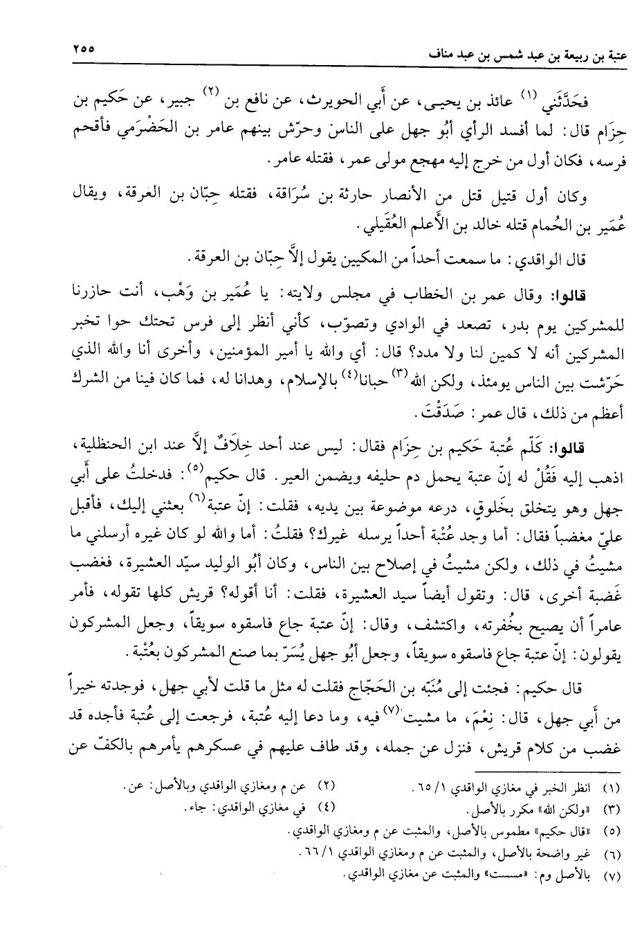 فحدثني (1) عائذ بن يحيى عن أبي الحويرث عن نافع بن (2) جبير عن حكيم بن حرام قال لما أفسد الرأي أبو جهل على الناس وحرش بينهم عامر بن الحضرمي فأقحم فرسه فكان أول من خرج إليه مهجع مولى عمر فقتله عامر وكان أول قتيل قتل من الأنصار حارثة بن سراقة فقتله حبان بن العرقة ويقال عمير بن الحمام قتله خالد بن الأعلم العقيلي قال الوافدي ما سمعت أحدا من المكيين يقول إلا حبان بن العرقة قالوا وقال عمر بن الخطاب في مجلس ولايته يا عمير بن وهب أنت حازرنا للمشركين يوم بدر تصعد في الوادي وتصوب كأني أنظر إلى فرس تحتك حوا تخبر المشركين أنه لا كمين لنا ولا مدد قال أي والله يا أمير المؤمنين وأخرى أنا والله الذي حرشت بين الناس يومئذ ولكن الله (3) حبانا (4) بالإسلام وهدانا له فما كان فينا من الشرك أعظم من ذلك قال عمر صدقت قالوا كلم عتبة حكيم بن حزام فقال ليس عند أحد خلاف إلا عند ابن الحنظلية اذهب إليه فقل له إن عتبة يحمل دم حليفه ويضمن العير قال حكيم (5) فدخلت على أبي جهل وهو يتخلق بخلوق درعه موضوعة بين يديه فقلت إن عتبة (6) بعثني إليك فأقبل علي مغضبا فقال أما وجد عتبة أحدا يرسله غيرك فقلت أما والله لو كان غيره أرسلني ما مشيت في ذلك ولكن مشيت في إصلاح بين الناس وكان أبو الوليد سيد العشيرة فغضب غضبة أخرى قال وتقول أيضا سيد العشيرة فقلت أنا أقوله قريش كلها تقوله فأمر عامر أن يصبح بخفرته واكتشف وقال إن عتبة جاع فاسقوه سويقا وجعل المشركون يقولون إن عتبة جاع فاسقوه سويقا وجعل أبو جهل يسر بما صنع المشركون بعتبة قال حكيم فجئت إلى منبه بن الحجاج فقلت له مثل ما قلت لأبي جهل فوجدته خيرا من أبي جهل قال نعم ما مشيت (7) فيه وما دعا إليه عتبة فرجعت إلى عتبة فأجده قد غضب من كلام قريش فنزل عن جمله وقد طاف عليهم في عسكرهم يأمرهم بالكف عن