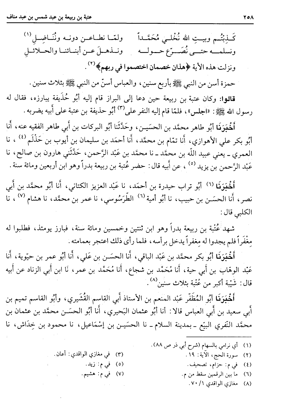 * كذبتم وبيت الله نخلي محمدا * ولما نطاعن دونه ونناضل (1) ونسلمه حتى نصرع حوله * ونذهل عن أبنائنا والحلائل * ونزلت هذه الآية هذان خصمان اختصموا في ربهم (2) حمزة أسن من النبي بأربع سنين والعباس أسن من النبي بثلاث سنين قالوا وكان عتبة بن ربيعة حين دعا إلى البراز قام إليه أبو حذيفة يبارزه فقال له رسول الله (صلى الله عليه وسلم) اجلس فلما قام إليه النفر على (3) أبو حذيفة بن عتبة على أبيه يضربه أخبرنا أبو طاهر محمد بن الحسين وحدثنا أبو البركات بن ابي طاهر الفقيه عنه أنا أبو بكر علي الأهوازي أنا تمام بن محمد أنا أحمد بن سليمان بن أيوب بن حذلم (4) نا العمري يعني عبيد الله بن محمد نا محمد بن عبد الرحمن حدثني هارون بن صالح نا عبد الرحمن بن يزيد (5) عن أبيه قال حضر عتبة بن ربيعة بدرا وهو ابن أربعين ومائة سنة أخبرنا (6) أبو تراب حيدرة بن أحمد نا عبد العزيز الكتاني أنا أبو محمد بن أبي نصر أنا الحسن بن حبيب نا أبو أمية (6) الطرسوسي نا عمر بن محمد نا هشام (7) نا الكلبي قال شهد عتبة بن ربيعة بدرا وهو ابن ثنتين وخمسين ومائة سنة فبارز يومئذ فطلبوا له مغفرا فلم يجدوا مغفرا يدخل برأسه فلما رأى ذلك اعتجز بعمامته أخبرنا أبو بكر محمد بن عبد الباقي أنا الحسن بن علي أنا أبو عمر بن حيوية أنا عبد الوهاب بن أبي حية أنا محمد بن شجاع أنا محمد بن عمر نا ابن أبي الزناد عن أبيه قال شيبة أكبر من عتبة بثلاث سنين (8) أخبرنا أبو المظفر عبد المنعم بن الأستاذ أبي القاسم القشيري وأبو القاسم تميم بن أبي سعيد بن أبي العباس قالا أنا أبو عثمان البحيري أنا أبو الحسن محمد بن عثمان بن محمد النفري البيع بمدينة السلام نا الحسين بن إسماعيل نا محمود بن خداش نا