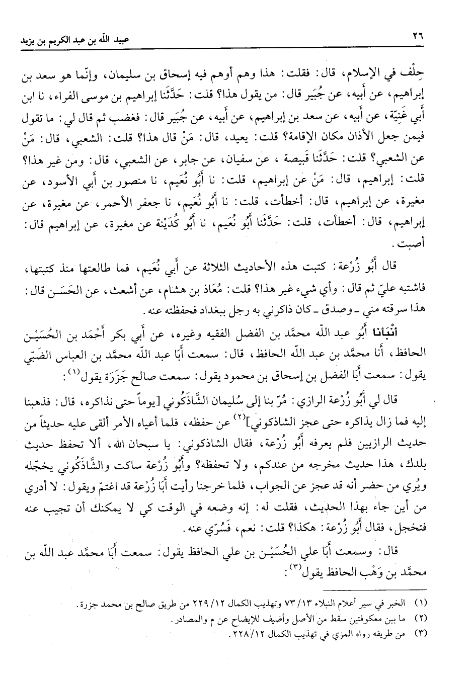 حلف في الإسلام فقال هذا وهم أوهم فيه إسحاق بن سليمان وإنما هو سعد بن إبراهيم عن أبيه عن جبير قال من يقول هذا قلت حدثنا إبراهيم بن موسى الفراء نا ابن أبي غنية عن أبيه عن سعد بن إبراهيم عن أبيه عن جبير قال فغضب ثم قال لي ما تقول فيمن جعل الأذان مكان الإقامة يعيد قال من قال هذا قلت الشعبي قال من عن الشعبي قلت حدثنا قبيصة عن سفيان عن جابر عن الشعبي قال ومن غير هذا قلت إبراهيم قال من عن إبراهيم قلت نا أبو نعيم نا منصور بن أبي الأسود عن مغيرة عن إبراهيم قال أخطأت قال نا أبو نعيم نا جعفر الأحمر عن مغيرة عن إبراهيم قال أخطأت قلت حدثنا أبو نعيم أنا أبو كدينة عن مغيرة عن إبراهيم قال أصبت قال أبو زرعة كتبت الأحاديث الثلاثة عن أبي نعيم فما طالعتها منذ كتبتها فاشتبه علي ثم قال وأي شئ غير هذا قلت معاذ بن هشام عن أشعث عن الحسن قال هذا سرقته مني وصدق كان ذاكرني به رجل ببغداد فحفظته عنه أنبأنا أبو عبد الله محمد بن الفضل الفقيه وغيره عن أبي بكر أحمد بن الحسين الحافظ أنا محمد بن عبد الله الحافظ قال سمعت أبا عبد الله محمد بن العباس الضبي يقول سمعت أبا الفضل بن إسحاق بن محمود يقول سمعت صالح جزرة يقول (1) قال لي أبو زرعة الرازي مر بنا سليمان الشاذكوني يوما حتى نذاكره قال فذهبنا إليه فما زال يذاكره حتى عجز الشاذكوني (2) عن حفظه فلما أعياه الأمر ألقى عليه حديثا من حديث الرازيين فلم يعرفه أبو زرعة فقال الشاذكوني يا سبحان الله ألا تحفظ حديث بلدك هذا حديث مخرجه من عندكم ولا تحفظه وأبو زرعة ساكت والشاذكوني يخجله ويري من حضر أنه قد عجز عن الجواب فلما خرجا رأيت أبو زرعة قد اغتم ويقول لا أدري من أين جاء بهذا الحديث فقلت له إنه وضعه في الوقت كي لا يمكنك أن تجيب عنه فتخجل فقال أبو زرعة هكذا قلت نعم فسري عنه قال وسمعت أبا علي بن الحسين بن علي الحافظ يقول سمعت أبا محمد عبد الله بن محمد بن وهب الحافظ يقول (3) :