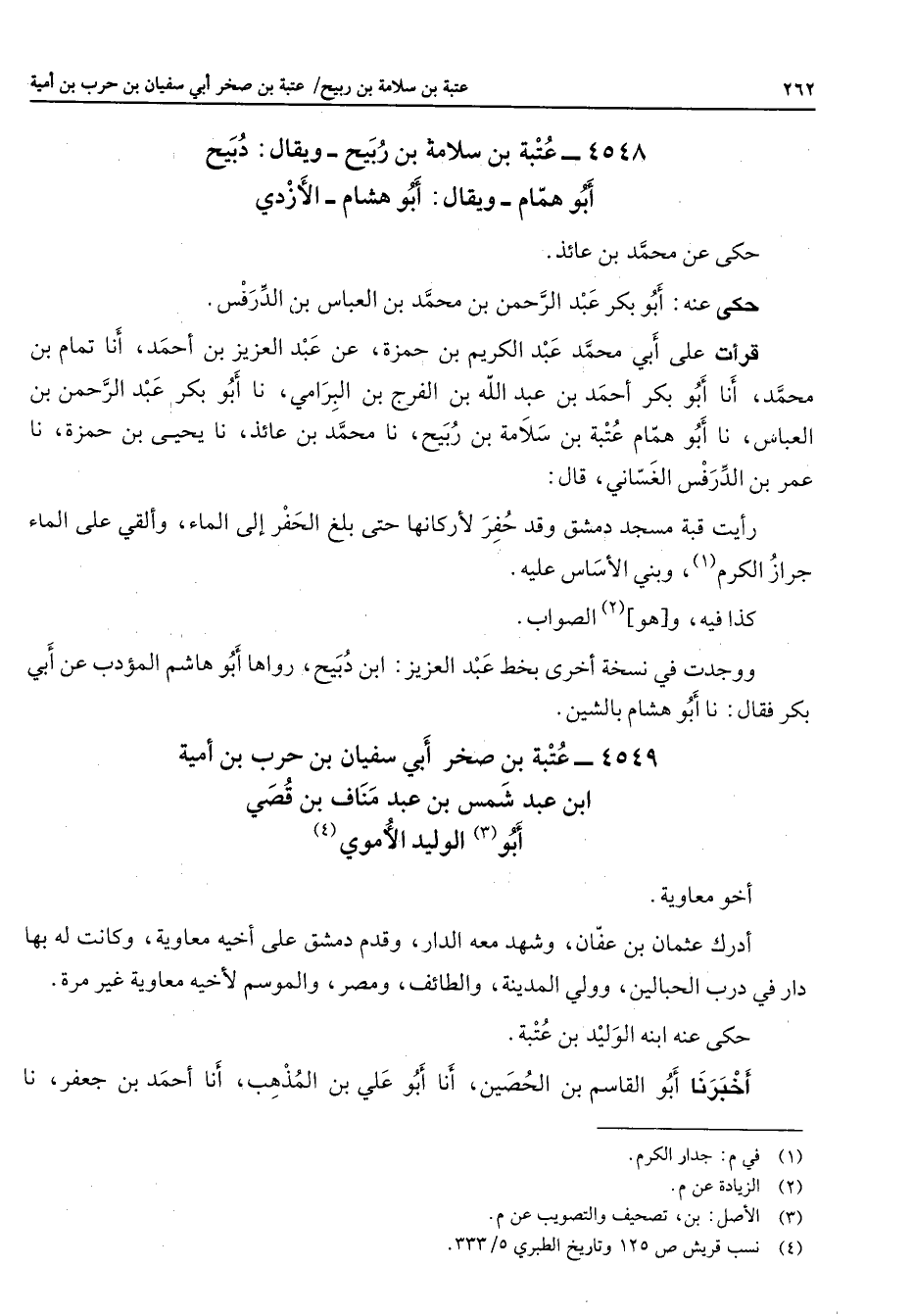 4548 - عتبة بن سلامة بن ربيح ويقال دبيح أبو همام ويقال أبو هشام الأزدي حكى عن محمد بن عائذ حكى عنه أبو بكر عبد الرحمن بن محمد بن العباس بن الدرفس قرأت على أبي محمد عبد الكريم بن حمزة عن عبد العزيز بن أحمد أنا تمام بن محمد أنا أبو بكر أحمد بن عبد الله بن الفرج بن البرامي نا أبو بكر عبد الرحمن بن العباس نا أبو همام عتبة بن سلامة بن ربيح نا محمد بن عائذ نا يحيى بن حمزة نا عمر بن الدرفس الغساني قال رأيت قبة مسجد دمشق وقد حفر لأركانها حتى بلغ الحفر إلى الماء وألقي على الماء جراز الكرم (1) وبني الأساس عليه كذا فيه وهو (2) الصواب ووجدت في نسخة أخرى بخط عبد العزيز ابن دبيح رواها أبو هاشم المؤدب عن أبي بكر فقال نا أبو هشام بالشين 4549 - عتبة بن صخر أبي سفيان بن حرب بن أمية ابن عبد شمس بن عبد مناف بن قصي أبو (3) الوليد الأموي (4) أخو معاوية أدرك عثمان بن عفان وشهد معه وقدم دمشق على أخيه معاوية وكانت له بها دار في درب الحبالين وولي المدينة والطائف ومصر والموسم لأخيه معاوية غير مرة حكى عنه ابنه الوليد بن عتبة أخبرنا أبو القاسم بن الحصين أنا أبو علي بن المذهب أنا أحمد بن جعفر نا