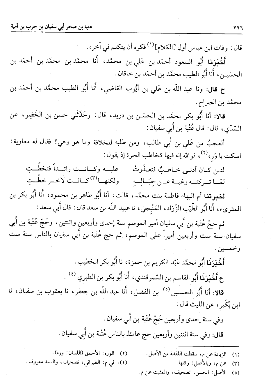 قال وفات ابن عباس أول الكلام (1) فكره أن يتكلم في آخره أخبرنا أبو السعود أحمد بن علي بن محمد أنا محمد بن محمد بن أحمد بن الحسين أنا أبو الطيب محمد بن أحمد بن خاقان ح قال وأنا عبد الله بن علي بن أيوب القاضي أنا أبو الطيب محمد بن أحمد بن محمد بن الجراح قالا أنا أبو بكر محمد بن الحسن بن دريد قال وحدثني حسن بن الخضر عن السدي قال قال عتبة بن أبي سفيان العجب من علي بن أبي طالب ومن طلبه للخلافة وما هو وهي فقال له معاوية اسكت يا وره (2) فوالله إنه فيها كخاطب الحرة إذ يقول * لئن كان أدنى خاطب فتعذرت * عليه وكانت رائدا فتخطت لما تركته رغبة عن حباله * ولكنها (3) كانت لآخر خطت * أخبرتنا أم البهاء فاطمة بنت محمد قالت أنا أبو طاهر بن محمود أنا أبو بكر بن المقرئ أنا أبو الطيب الزراد المنبجي نا عبيد الله بن سعد قال قال أبي سعد ثم حج عتبة بن أبي سفيان أمير الموسم سنة إحدى وأربعين واثنتين وحج عتبة بن أبي سفيان سنة ست وأربعين أميرا على الموسم ثم حج عتبة بن أبي سفيان بالناس سنة ست وخمسين أخبرنا أبو محمد عبد الكريم بن حمزة نا أبو بكر الخطيب ح أخبرنا أبو القاسم بن السمرقندي أنا أبو بكر بن الطبري (4) قالا أنا أبو الحسين (5) بن الفضل أنا عبد الله بن جعفر نا يعقوب بن سفيان نا ابن بكير عن الليث قال وفي سنة إحدى وأربعين حج عتبة بن أبي سفيان قال وفي سنة اثنتين وأربعين حج عامئذ بالناس عتبة بن أبي سفيان