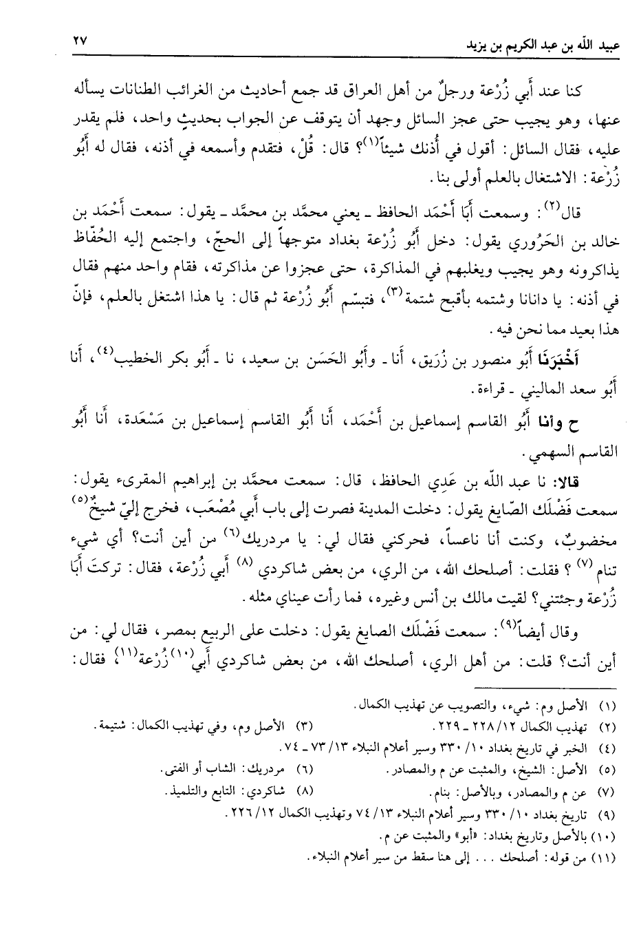 (9) تاريخ بغداد 10 / 330 وسير أعلام النبلاء 13 / 74 وتهذيب الكمال 12 / 226