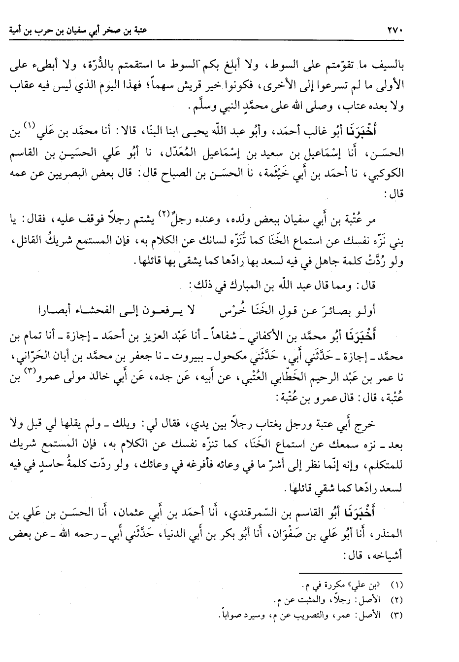 بالسيف ما تقومتم على السوط ولا أبلغ بكم السوط ما استقمتم بالدرة ولا أبطئ على الأولى ما لم تسرعوا إلى الأخرى فكونوا خير قريش سهما فهذا اليوم الذي ليس فيه عقاب ولا بعده عتاب وصلى الله على محمد النبي وسلم أخبرنا أبو غالب أحمد وأبو عبد الله يحيى ابنا البنا قالا أنا محمد بن علي (1) بن الحسن أنا إسماعيل بن سعيد بن إسماعيل المعدل نا أبو علي الحسين بن القاسم الكوكبي نا أحمد بن أبي خيثمة نا الحسن بن الصباح قال قال بعض البصريين عن عمه قال مر عتبة بن أبي سفيان ببعض ولده وعنده رجل (2) يشتم رجلا فوقف عليه فقال يا بني نزه نفسك عن استماع الخنا كما تنزه لسانك عن الكلام به فإن المستمع شريك القائل ولو ردت كلمة جاهل في فيه لسعد بها رادها كما يشقى بها قائلها قال ومما قال عبد الله بن المبارك في ذلك * أولو بصائر عن قوم الخنا خرس * لا يرفعون إلى الفحشاء أبصارا * أخبرنا أبو محمد بن الأكفاني شفاها أنا عبد العزيز بن أحمد إجازة أنا تمام بن محمد إجازة حدثني أبي حدثني مكحول ببيروت نا جعفر بن محمد بن أبان الحراني أنا عمر بن عبد الرحيم الخطابي العتبي عن أبيه عن جده عن أبي خالد مولى عمرو (3) بن عتبة قال قال عمرو بن عتبة خرج أبي عتبة ورجل يغتاب رجلا بين يدي فقال لي ويلك ولم يقلها لي قبل ولا بعد نزه سمعك عن استماع الخنا كما تنزه نفسك عن الكلام به فإن المستمع شريك للمتكلم وإنه إنما نظر إلى أشر ما في وعائه فأفرغه في وعائك ولو ردت كلمة حاسد في فيه لسعد رادها كما شقي قائلها أخبرنا أبو القاسم بن السمرقندي أنا أحمد بن أبي عثمان أنا الحسن بن علي بن المنذر أنا أبو علي بن صفوان أنا أبو بكر بن أبي الدنيا حدثني أبي رحمه الله عن بعض أشياخه قال