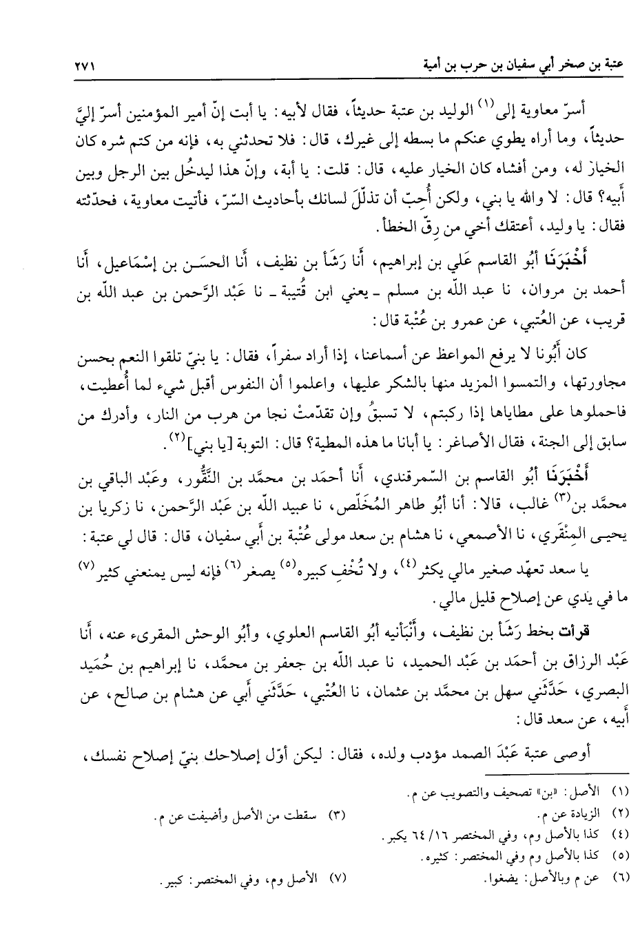 أسر معاوية إلى (1) الوليد بن عتبة حديثا فقال لأبيه يا أبت إن أمير المؤمنين أسر إلي حديثا وما أراه يطوي عنكم ما بسطه إلى غيرك قال فلا تحدثنا به فإنه من كتم شره كان الخيار له ومن أفشاه كان الخيار عليه قال قلت يا أبة وإن هذا ليدخل بين الرجل وبين أبيه قال لا والله يا بني ولكن أحب أن تذلل لسانك بأحاديث السر فأتيت معاوية فحدثته فقال يا وليد أعتقك أخي من رق الخطأ أخبرنا أبو القاسم علي بن إبراهيم أنا رشأ بن نظيف أنا الحسن بن إسماعيل أنا أحمد بن مروان نا عبد الله بن مسلم يعني ابن قتيبة نا عبد الرحمن بن عبد الله بن قريب عن العتبي عن عمرو بن عتبة قال كان أبونا لا يرفع المواعظ عن أسماعنا إذا أراد سفرا فقال يا بني تلقوا النعم بحسن مجاورتها والتمسوا المزيد منها بالشكر عليها واعلموا أن النفوس أقبل شئ لما أعطيت فاحملوها على مطاياها إذا ركبتم لا تسبق وإن تقدمت نجا من هرب من النار وأدرك من سابق إلى الجنة فقال الأصاغر يا أبانا ما هذه المطية قال التوبة يا بني (2) أخبرنا أبو القاسم بن السمرقندي أنا أحمد بن محمد بن النقور وعبد الباقي بن محمد بن (3) غالب قالا أنا أبو طاهر المخلص نا عبيد الله بن عبد الرحمن نا زكريا بن يحيى المنقري نا الأصمعي نا هشام بن سعد مولى عتبة بن أبي سفيان قال قال لي عتبة يا سعد تعهد صغير مالي يكثر (4) ولا تخف كبيره (5) يصغر (6) فإنه ليس يمنعني كثير (7) ما في يدي عن إصلاح قليل مالي قرأت بخط رشأ بن نظيف وأنبأنيه أبو القاسم العلوي وأبو الوحش المقرئ عنه أنا عبد الرزاق بن أحمد بن عبد الحميد نا عبد الله بن جعفر بن محمد نا إبراهيم بن حميد البصري حدثني سهل بن محمد بن عثمان نا العتبي حدثني أبي عن هشام بن صالح عن أبيه عن سعد قال أوصى عتبة عبد الصمد مؤدب ولده فقال ليكن أول إصلاحك بني إصلاح نفسك